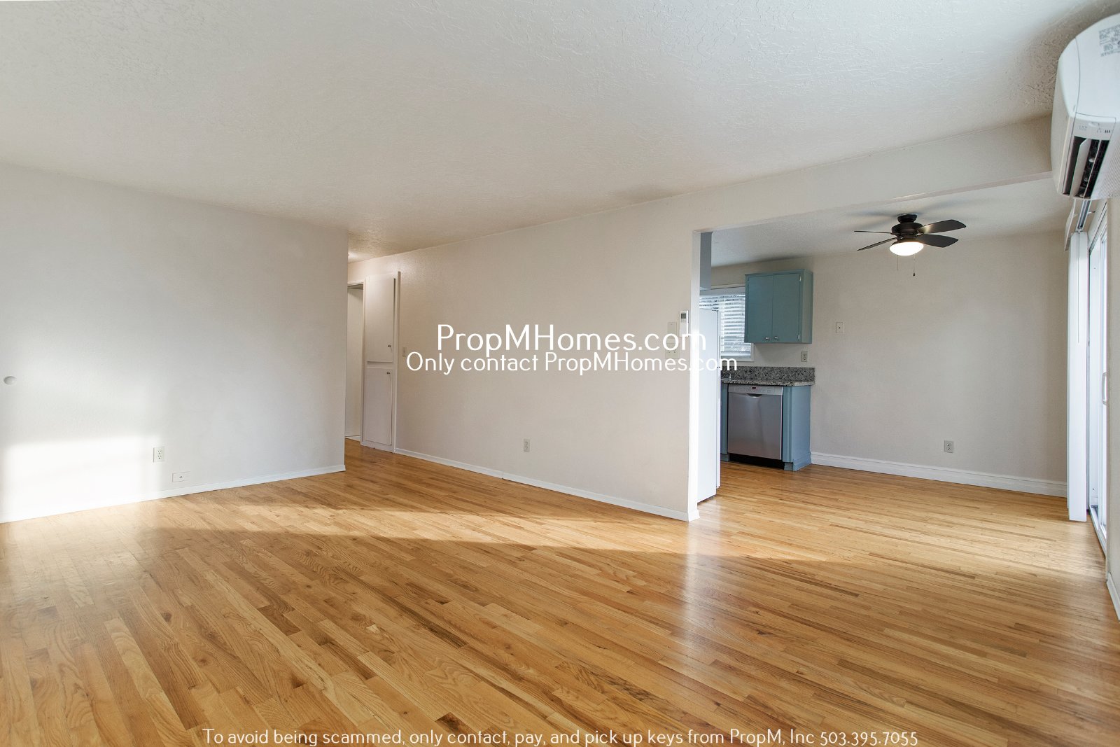 -Spacious living area with hardwood floors, ample light, and ceiling fan