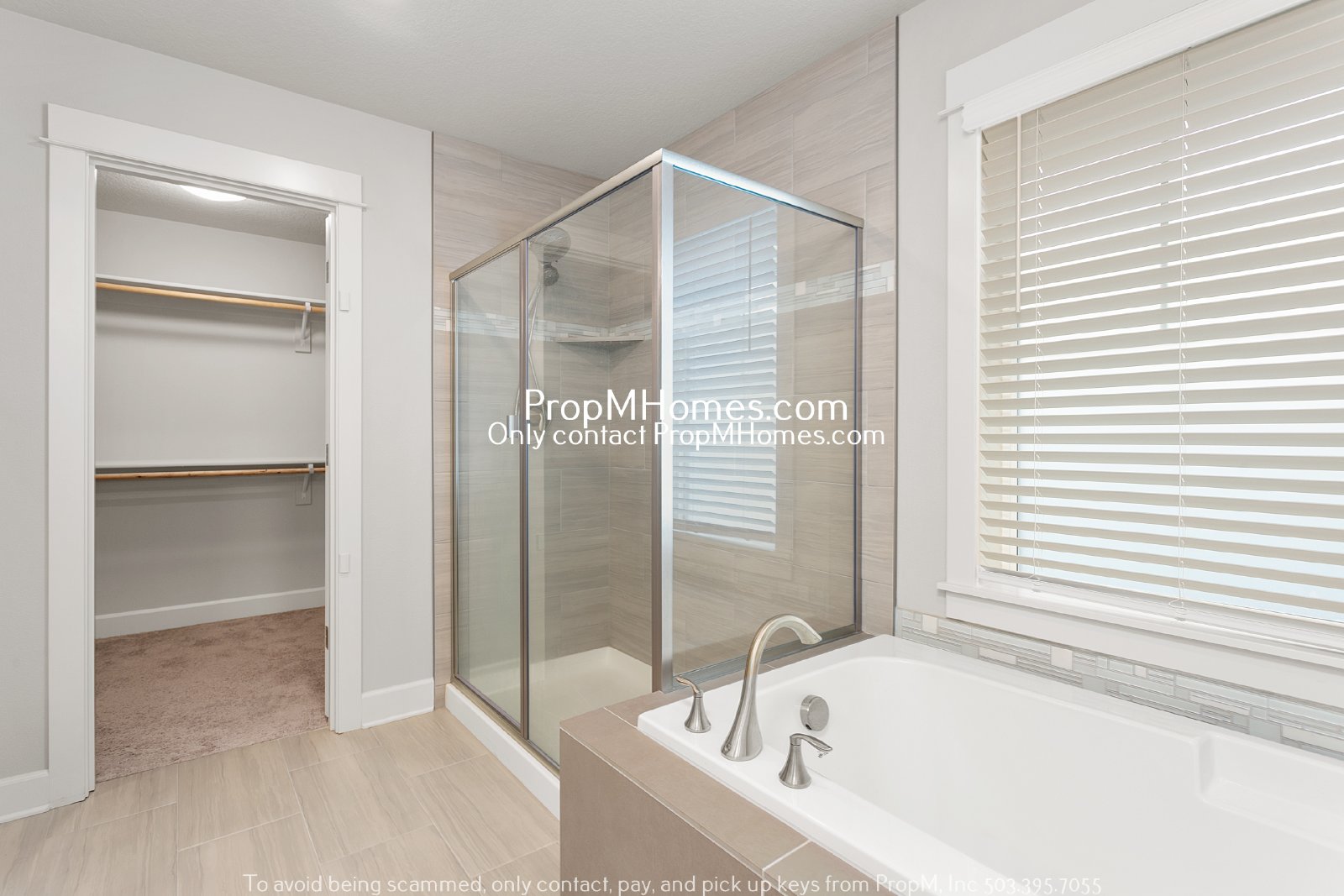 -Luxurious primary suite with walk-in closet and spa-style bath: soaking tub, walk-in shower, dual vanities