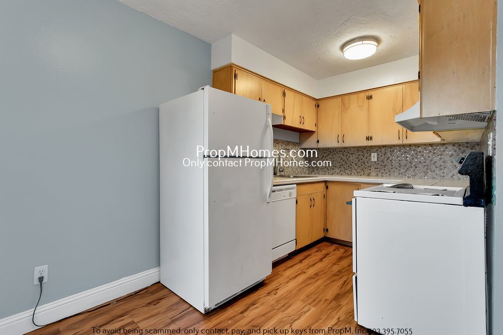 The kitchen has white countertops and light wood cabinetry. You have sleek white appliances including an electric stove with an oven, dishwasher, and refrigerator. Off of your kitchen, you have a balcony area that wraps around the front of your home. The Perfect place to relax after a long day!