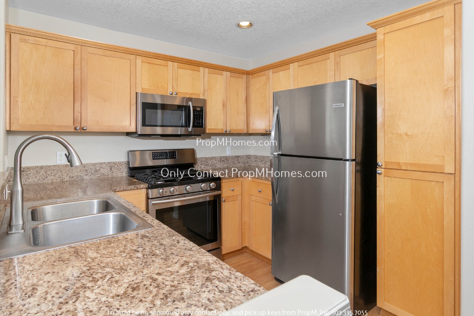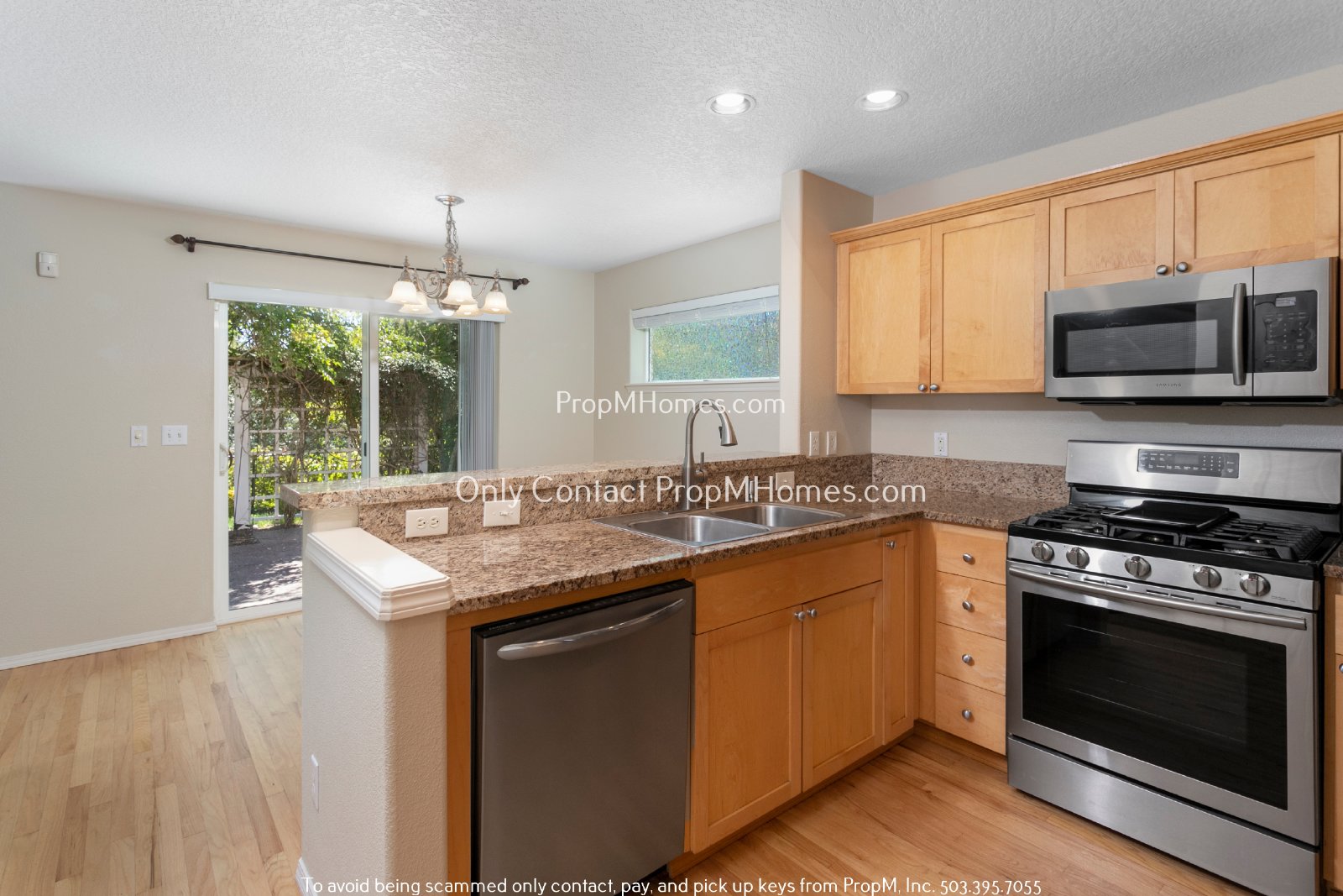This kitchen features warm wood cabinetry paired with granite countertops, creating a welcoming and functional space. The appliances, all in sleek stainless steel, include a gas range with an oven, an overhead microwave, a dishwasher, and a spacious refrigerator, adding a modern touch. A dual-basin sink with a high-arched faucet is conveniently situated on the counter, making meal prep and clean-up easy. The layout opens up to a bright dining area, with large windows and a sliding glass door that leads to an outdoor space, filling the kitchen with natural light.