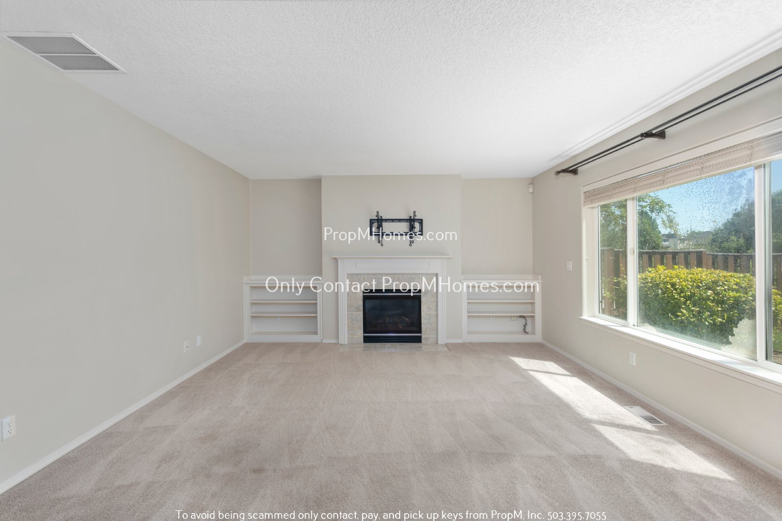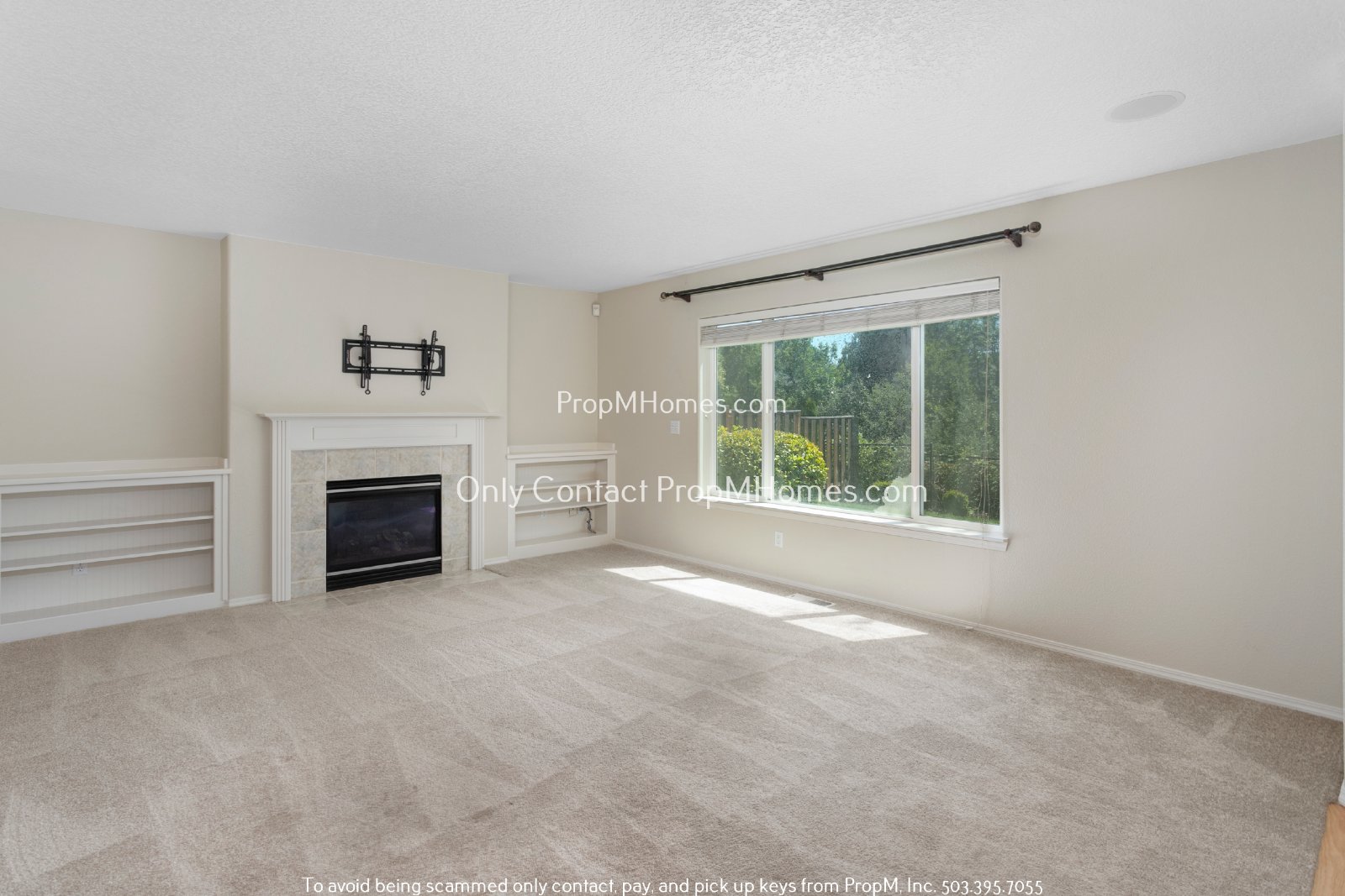 This spacious living area is bright and inviting, featuring a cozy fireplace framed by built-in shelves, perfect for displaying decor or storing essentials. A large window fills the room with natural light, offering serene views of the landscaped backyard and creating a seamless connection with the outdoors. The soft, neutral-toned carpeting adds warmth, making this an ideal space for relaxation or entertaining. With its minimalist charm and ample light, this living area provides a comfortable and versatile setting for everyday living.