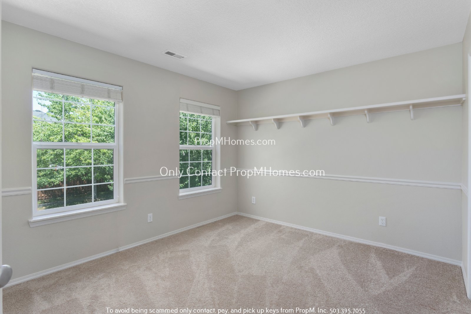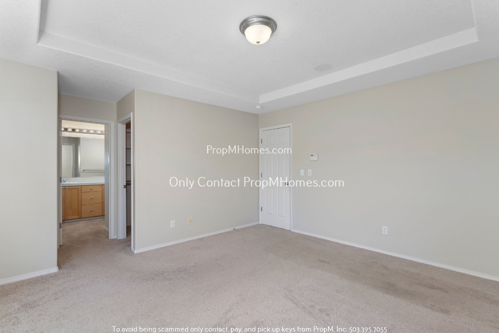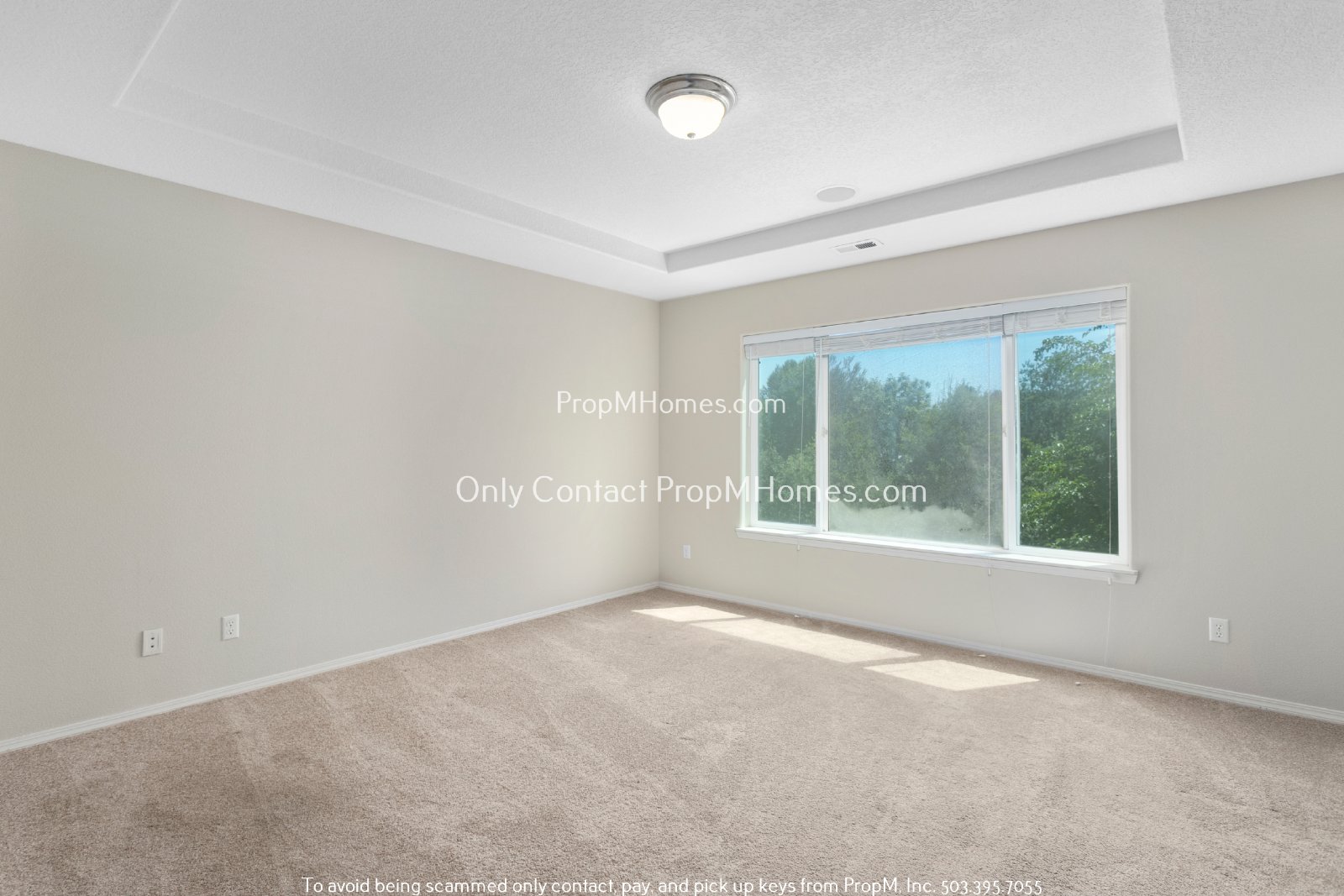 This home features four spacious bedrooms and two and a half bathrooms, offering both comfort and functionality. The primary suite includes a tray ceiling, plush carpeting, a large window, and a roomy walk-in closet, with an en-suite bathroom featuring a double vanity and walk-in shower. An additional full bathroom has a shower/tub combo and an expansive vanity, while the secondary bedrooms offer wide windows, carpet, shelving, and ample closet space. A versatile main-floor bedroom with closet space is perfect as a home office. The half bathroom includes a pedestal sink, mirror, and medicine cabinet for added convenience.