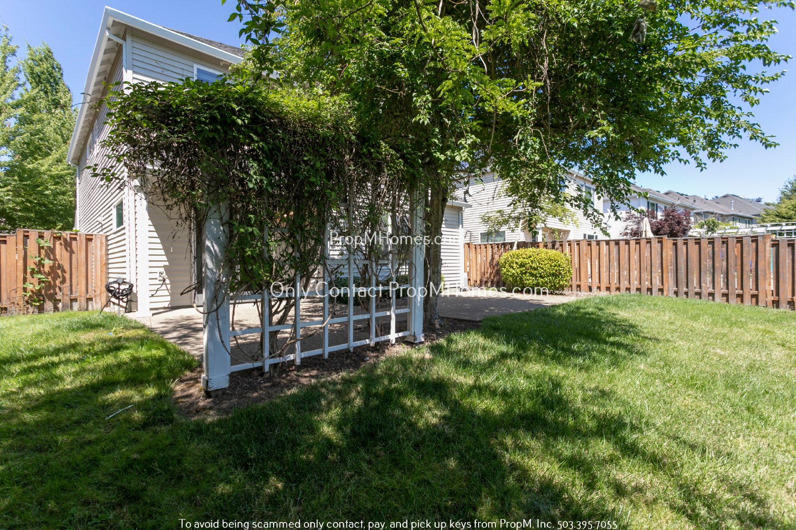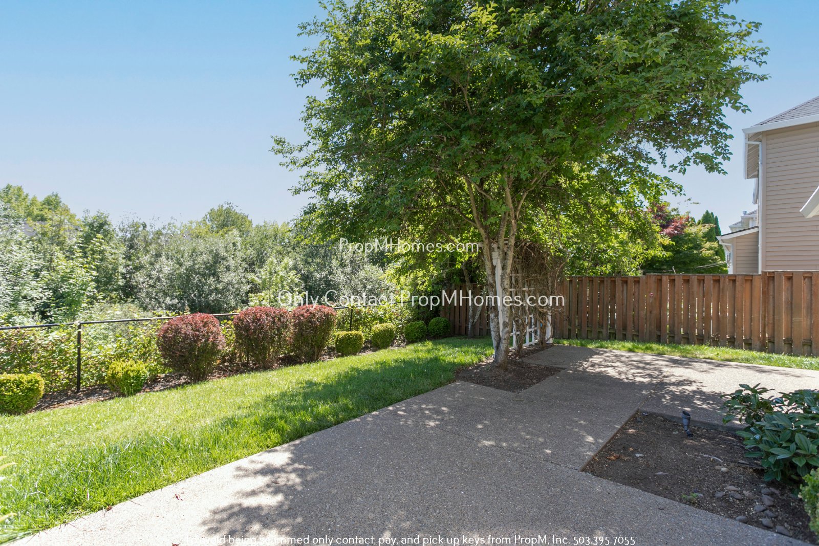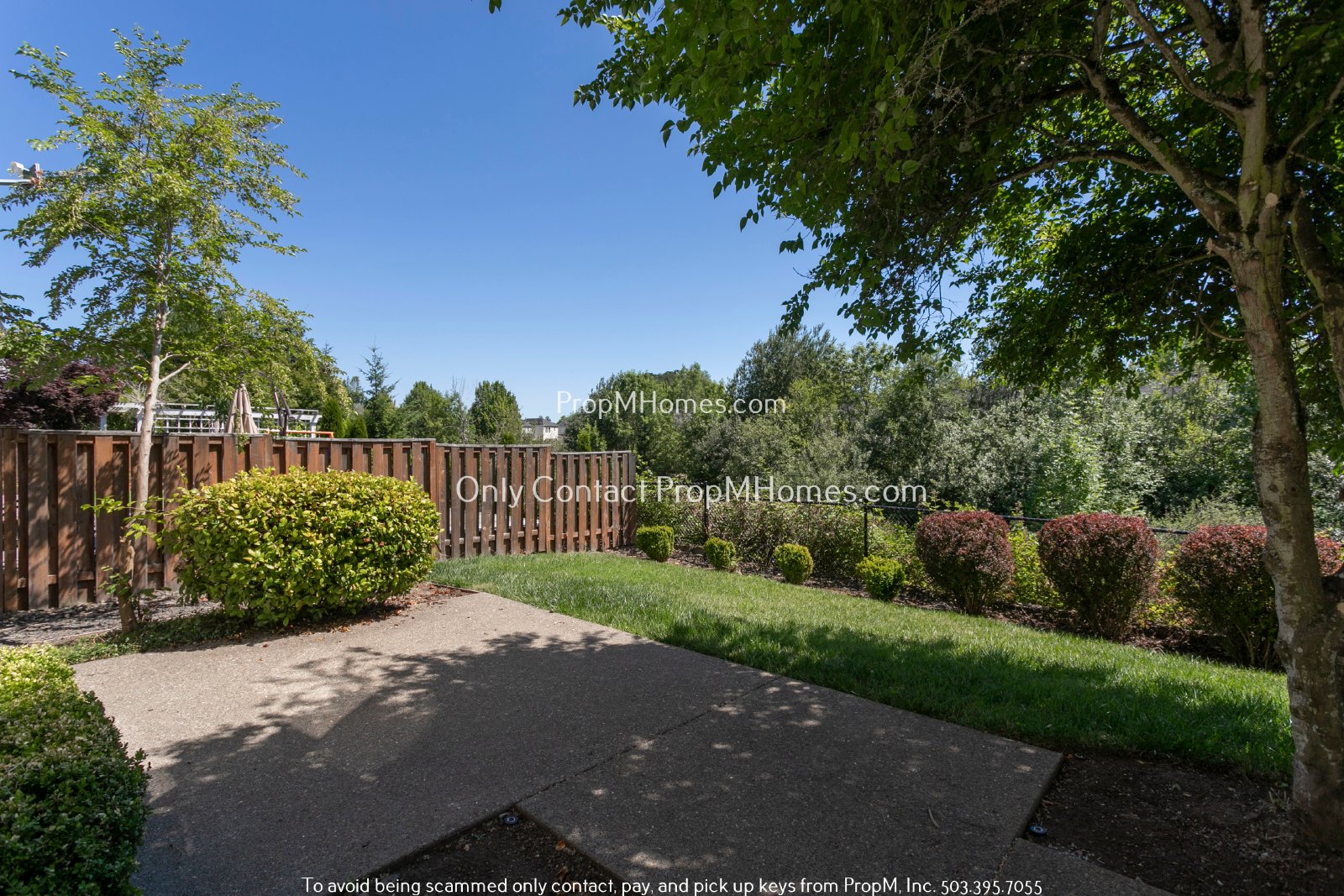 This property offers convenient parking options with a spacious driveway and a two-car garage. The front yard adds curb appeal, while the fenced backyard provides a private oasis with a lovely blend of greenery and landscaping. Enjoy the outdoor patio for gatherings or relaxation, surrounded by a lush lawn and various plants that create a serene environment. This backyard space combines functionality and beauty, ideal for peaceful outdoor living.