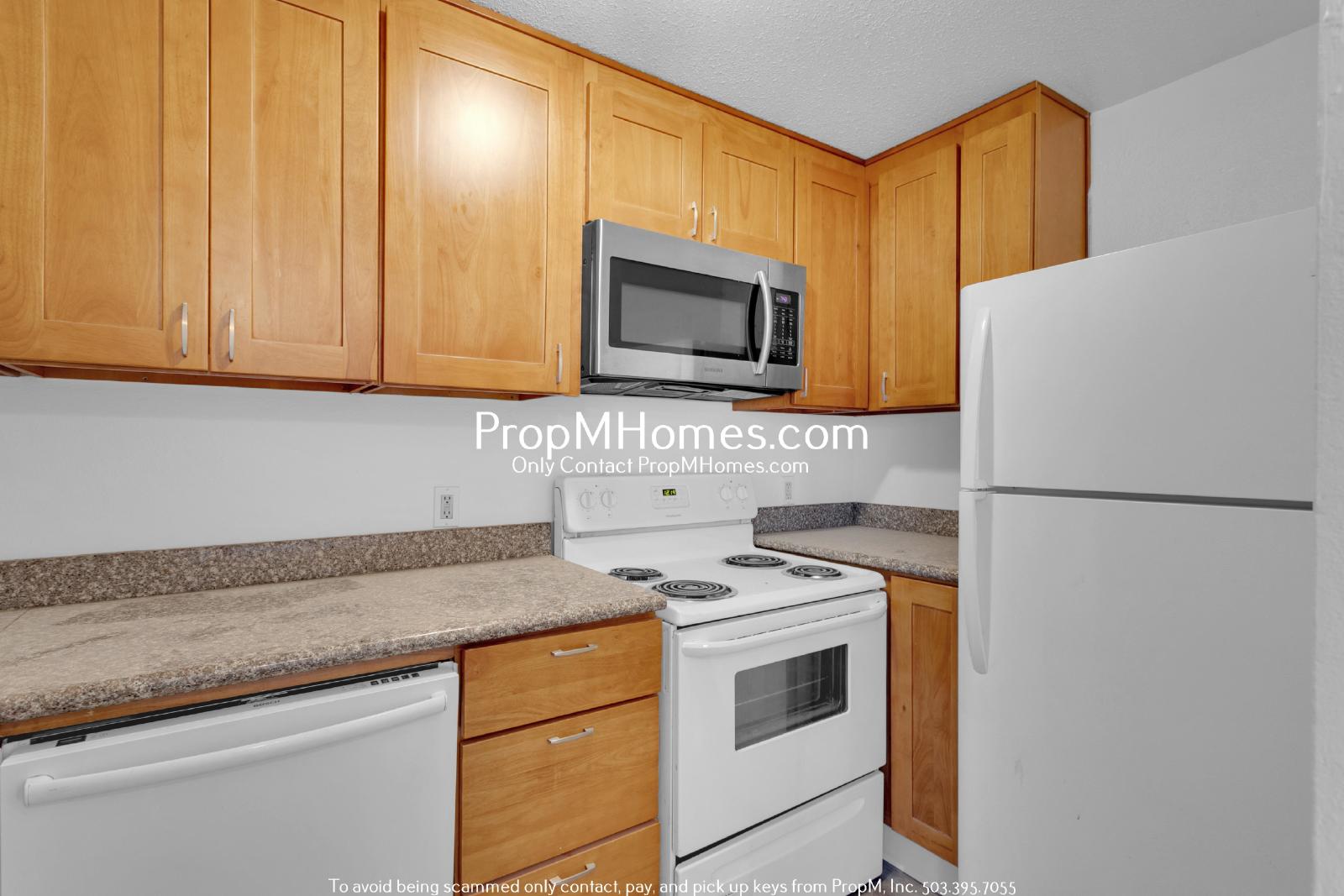 -Stainless steel appliances: refrigerator, electric stove/oven, dishwasher, and microwave