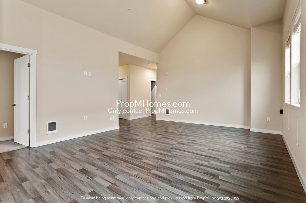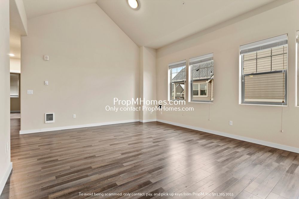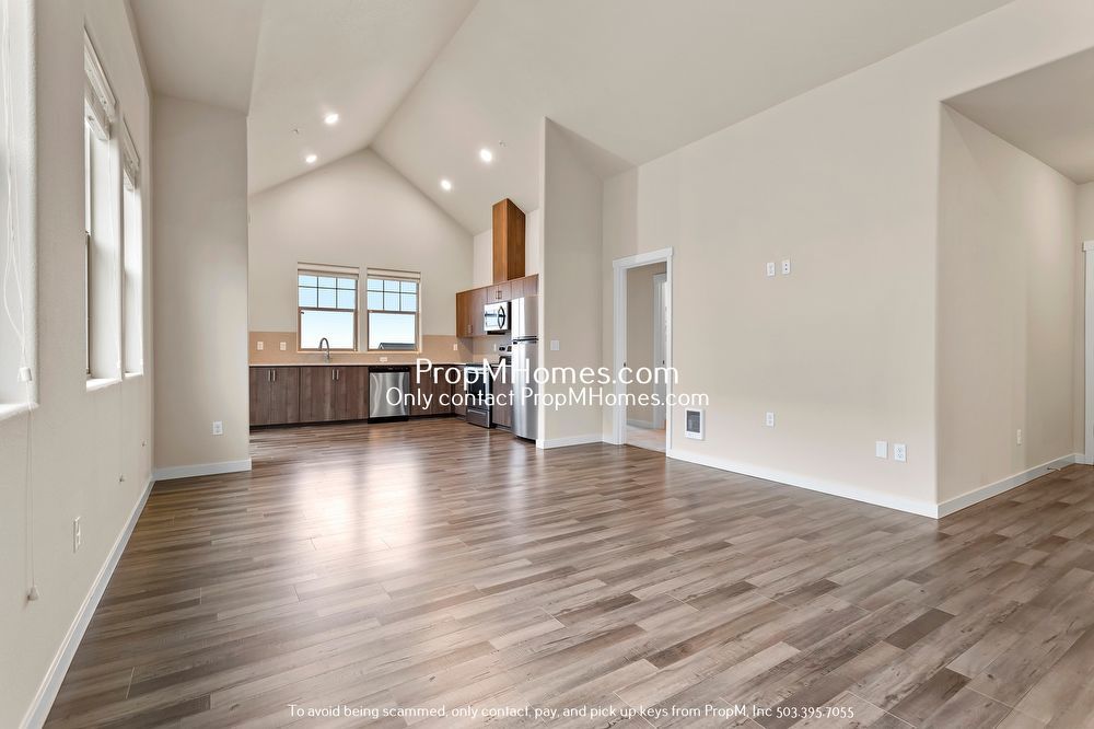 The living area exudes warmth and modernity with its faux wood flooring and light-toned walls, creating an inviting ambiance. The open kitchen/living concept seamlessly integrates cooking and relaxation spaces, perfect for hosting gatherings or simply enjoying everyday living. Large windows adorn the room, flooding it with natural light and highlighting the high ceilings, adding an airy and spacious feel to the entire area.
