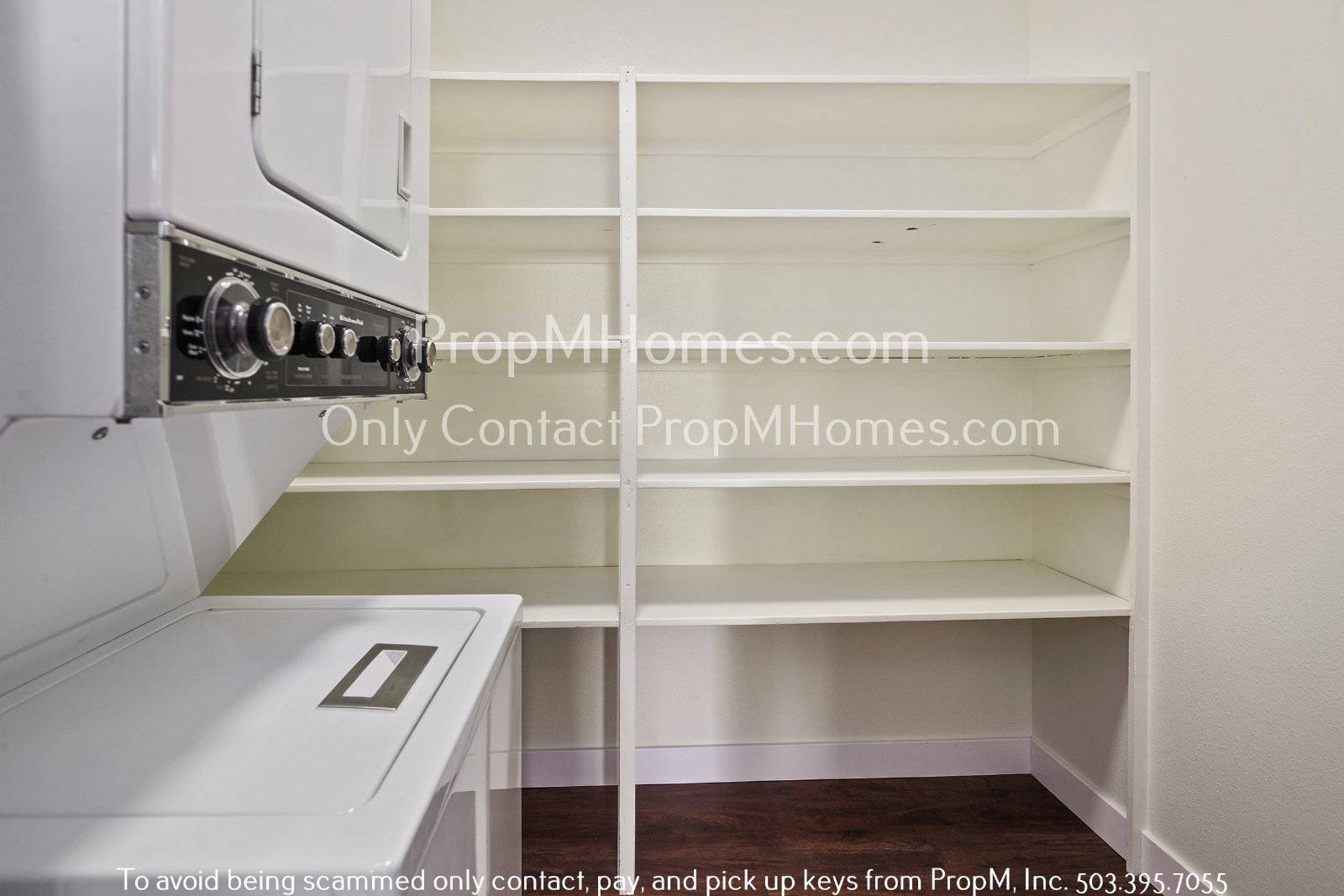 This home radiates style, boasting a unique tile backsplash and a dash of retro charm, complete with a sleek white oven/stove top combo, dishwasher, and refrigerator. It's the perfect kitchen to whip up any meal with a touch of flair. The extra large walk-in pantry includes floor-to-ceiling shelves and a stacked washer and dryer for your convenience.