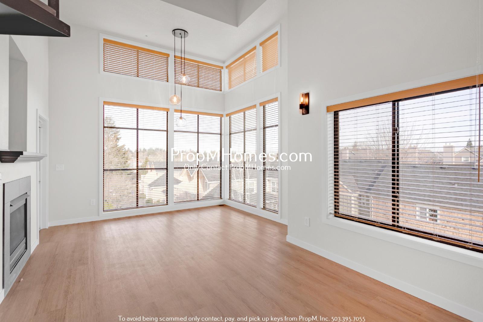 As soon as you enter, you'll be greeted by soaring two-story ceilings and stunning floor-to-ceiling windows that flood the space with natural light. The spacious great room features brand new hardwood-style flooring, a cozy gas fireplace, and generous space for dining and entertaining. Every inch of this unit has been tastefully remodeled with modern finishes and fresh paint, delivering a crisp, contemporary feel throughout. Step out onto your private balcony to enjoy unobstructed neighborhood views — perfect for morning coffee or evening wind-downs.