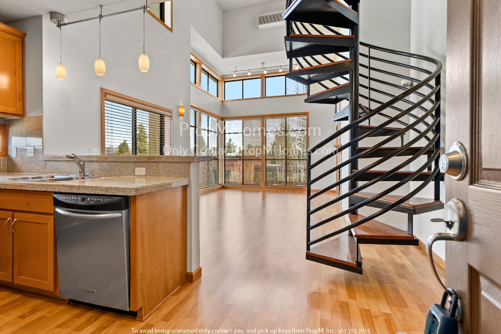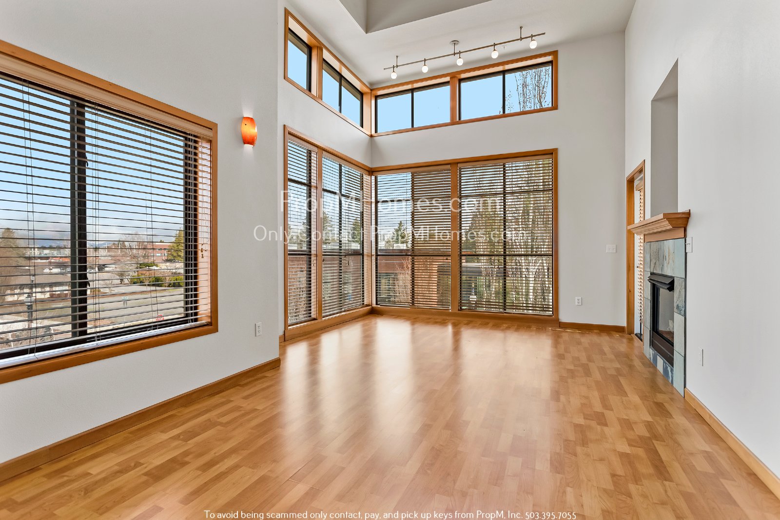 Be inspired by this stunning open-concept space, featuring dramatic vaulted ceilings and expansive windows that flood the interior with natural light. Fresh white walls complement the rich honey-toned hardwood flooring, while a sophisticated gas fireplace creates an elegant focal point. A designer spiral staircase adds architectural interest, leading to the private upper level while maintaining the home's airy, spacious feel.