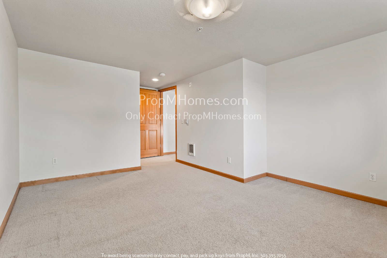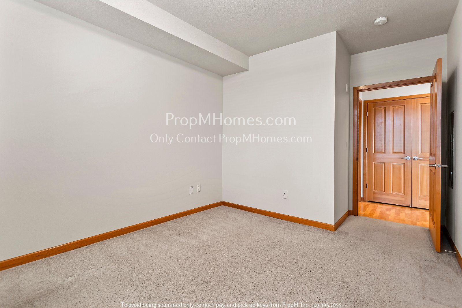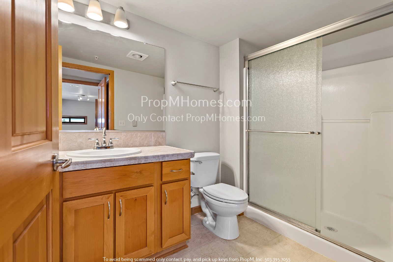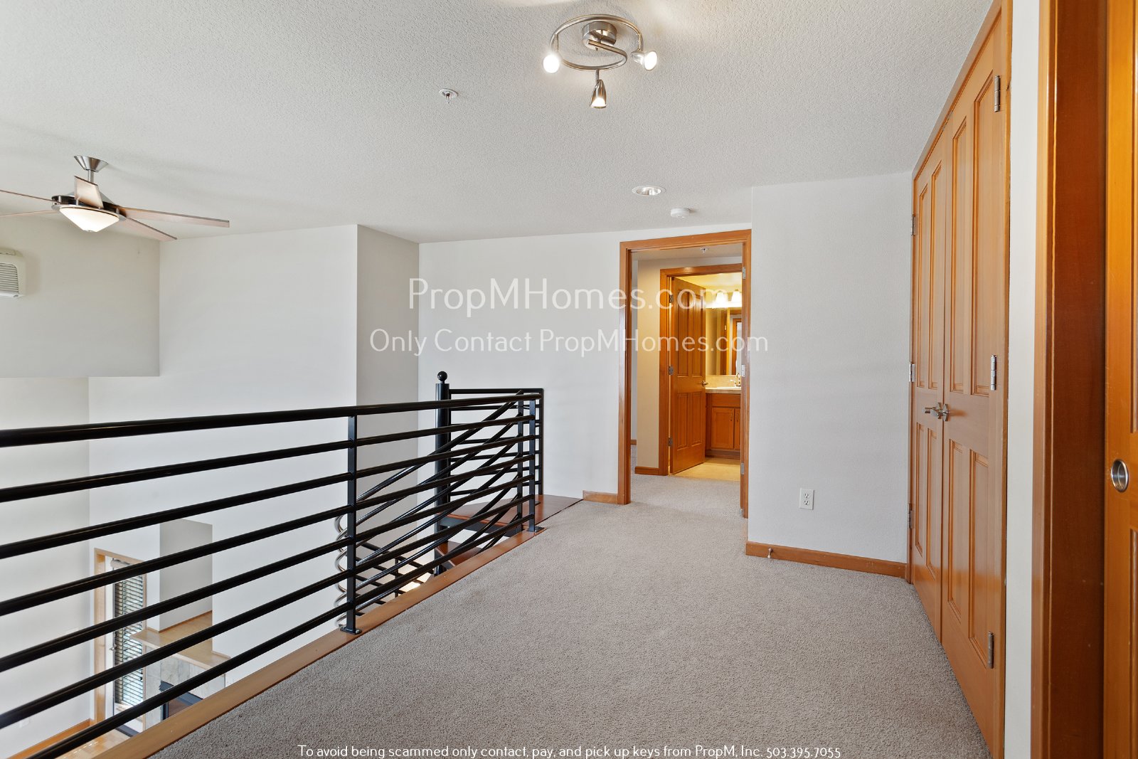Located on the upper level, the generously sized bedroom suite offers a peaceful retreat with new plush carpeting and abundant natural light through wood-framed windows. The well-appointed bathroom features a modern walk-in shower and granite vanity, while a spacious walk-in closet provides ample storage. The upper level's open loft area creates an ideal home office or sitting room with additional closet space.