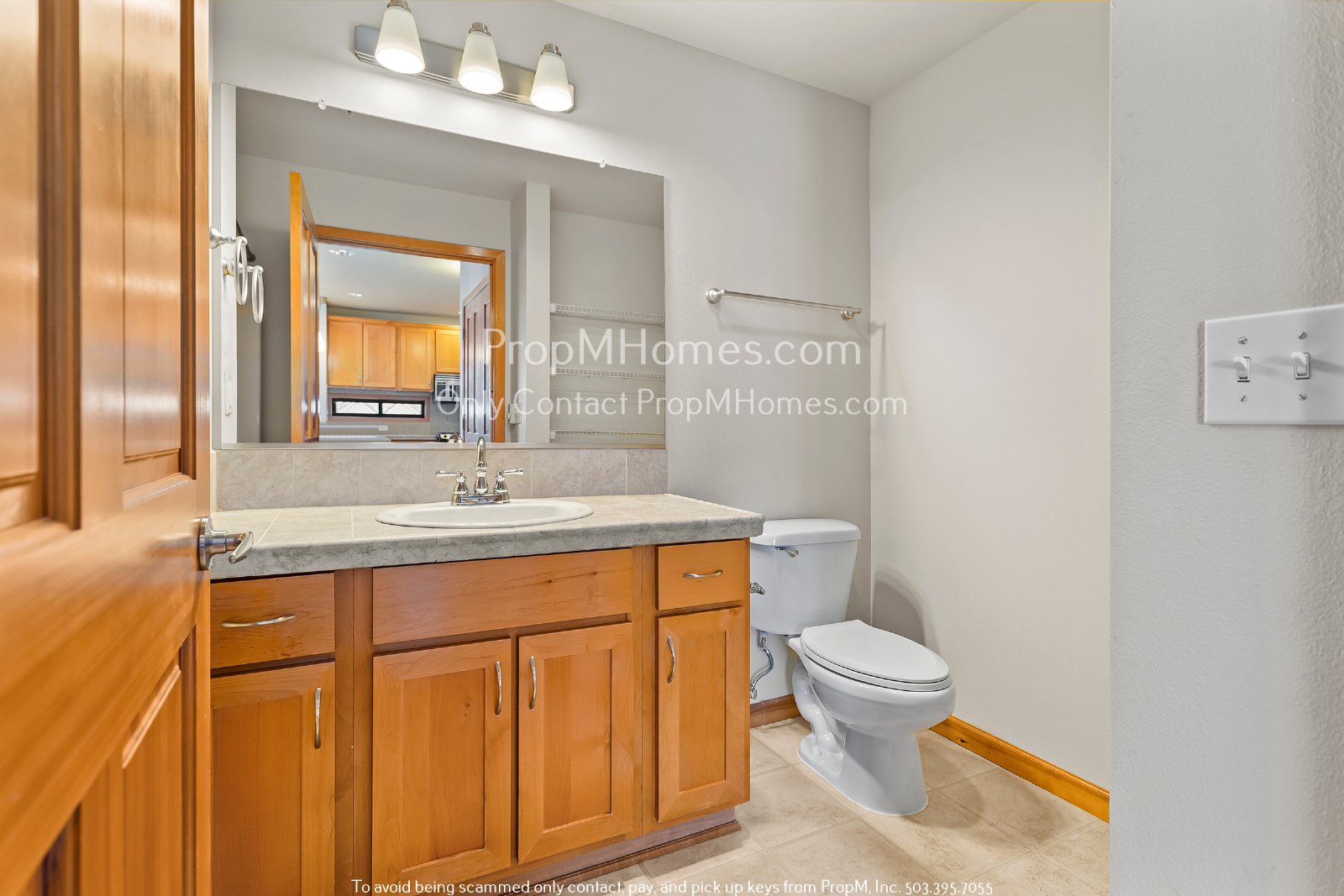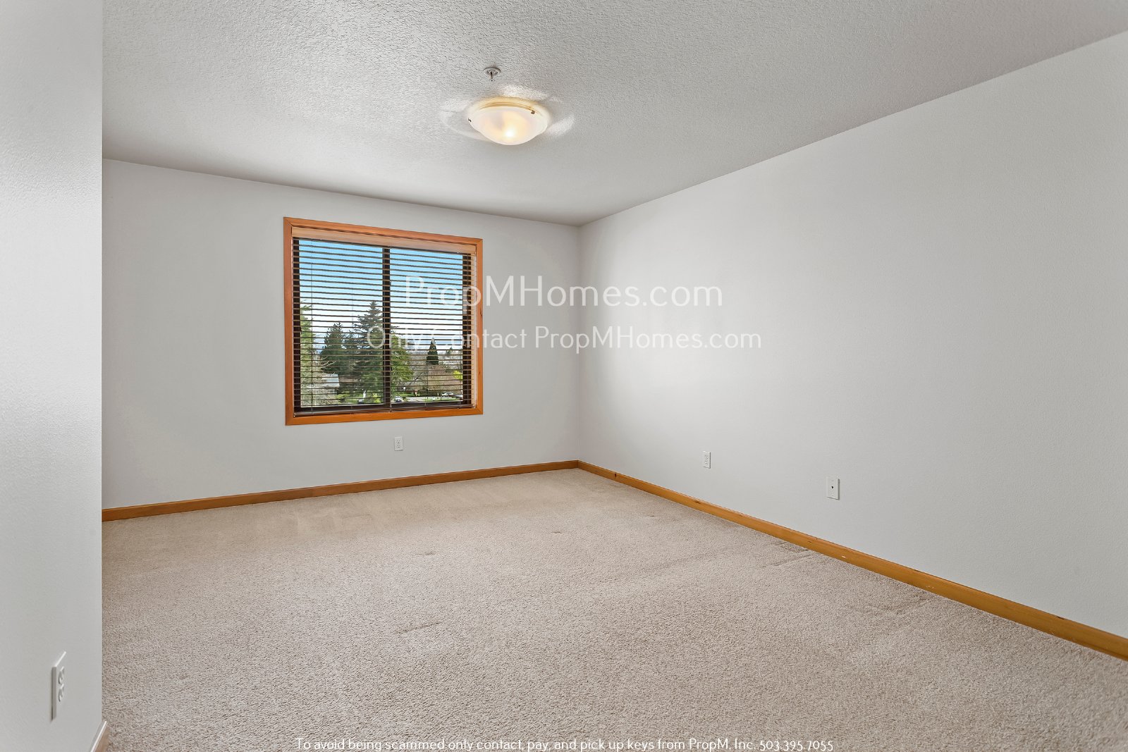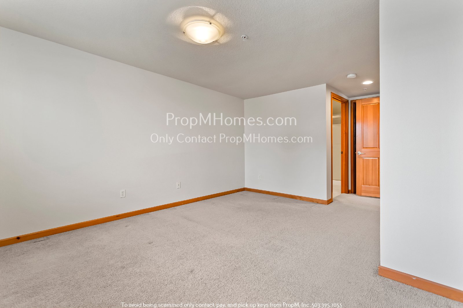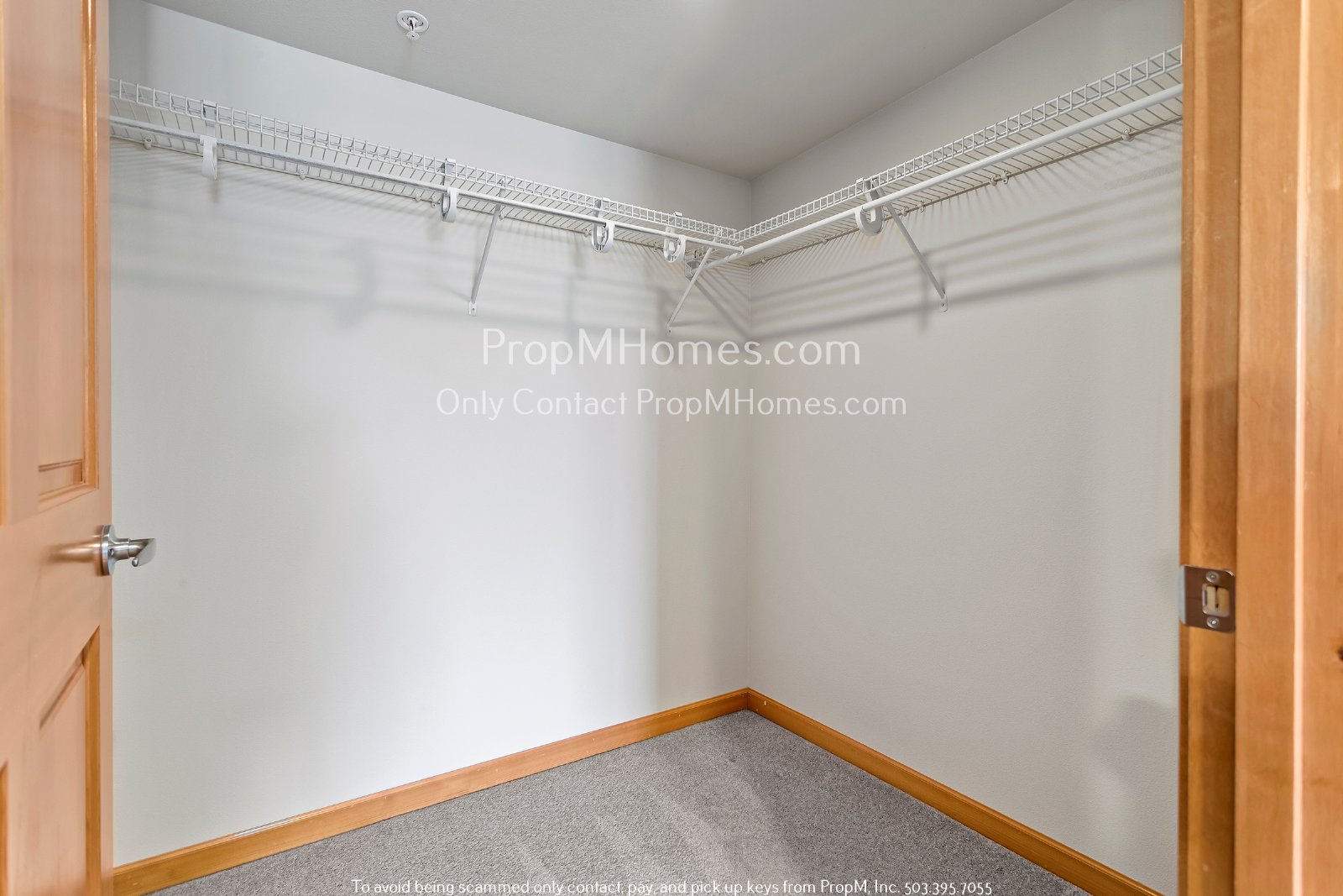 Located on the upper level, the generously sized bedroom suite offers a peaceful retreat with new plush carpeting and abundant natural light through wood-framed windows. The well-appointed bathroom features a modern walk-in shower and granite vanity, while a spacious walk-in closet provides ample storage. The upper level's open loft area creates an ideal home office or sitting room with additional closet space.