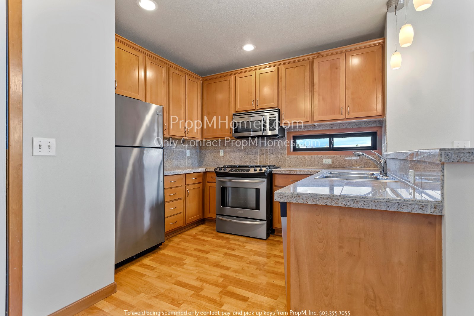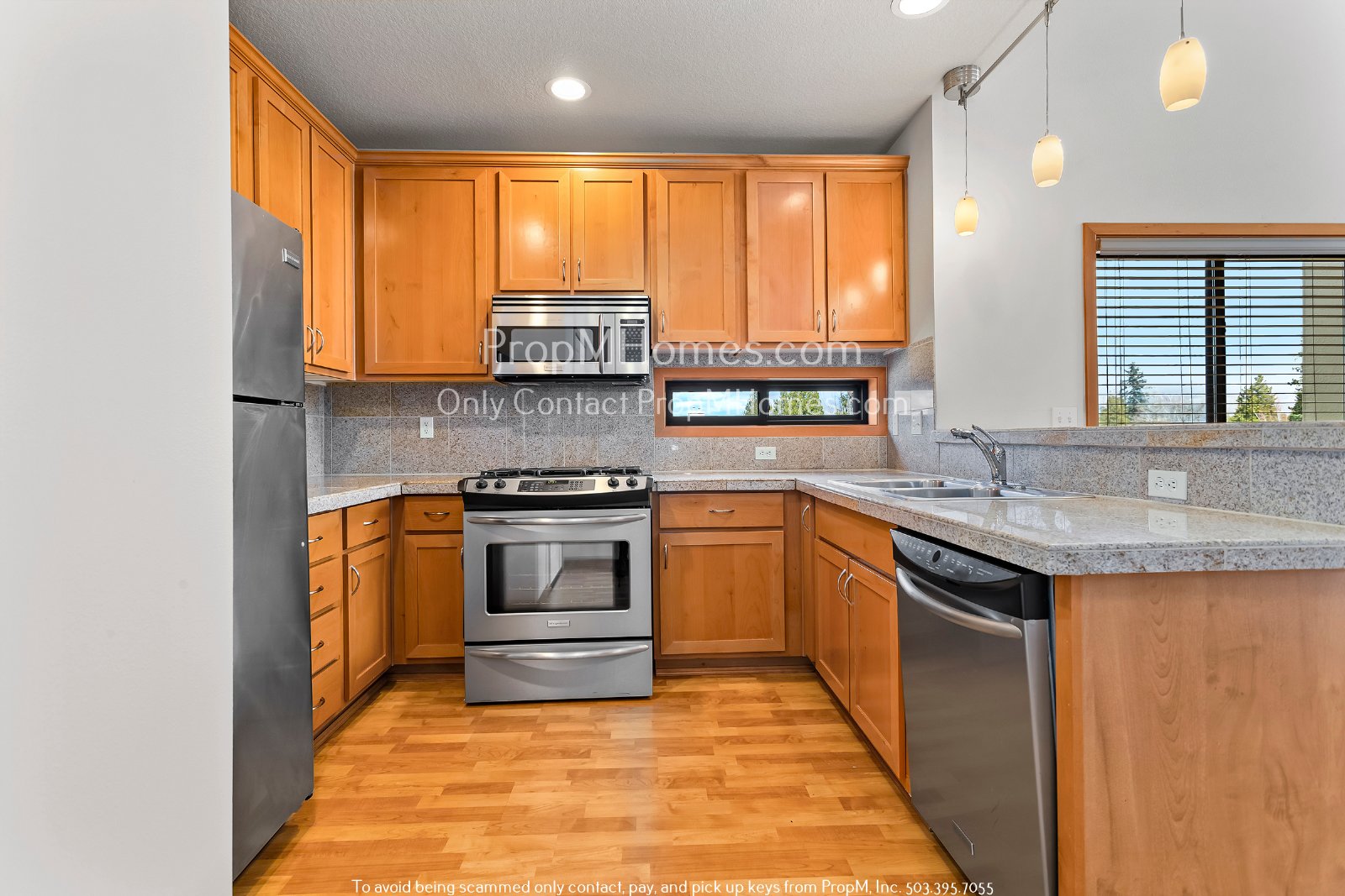 This gourmet kitchen harmoniously blends style and functionality, showcasing sleek granite countertops and warm honey maple cabinetry. The efficient U-shaped design comes equipped with modern stainless steel appliances, including a gas range, built-in microwave, side-by-side refrigerator, and whisper-quiet dishwasher. Stylish pendant lighting illuminates the breakfast bar, perfect for casual dining or entertaining.