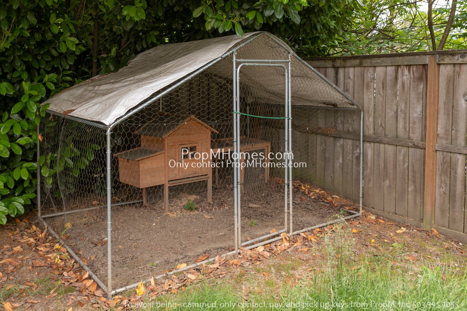 -Backyard chicken run and coop—chickens welcome and encouraged