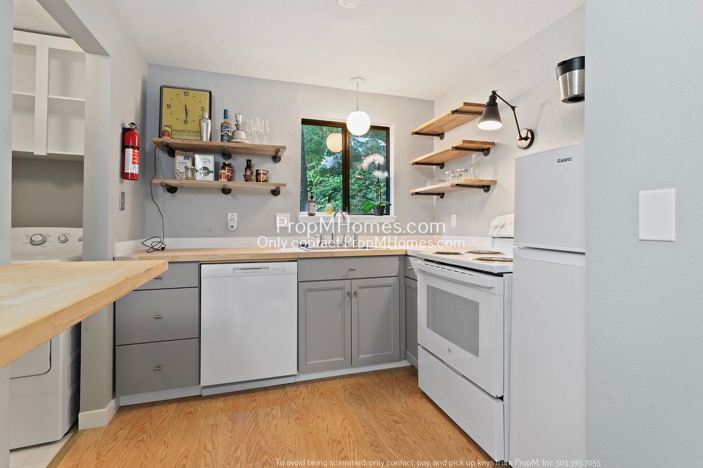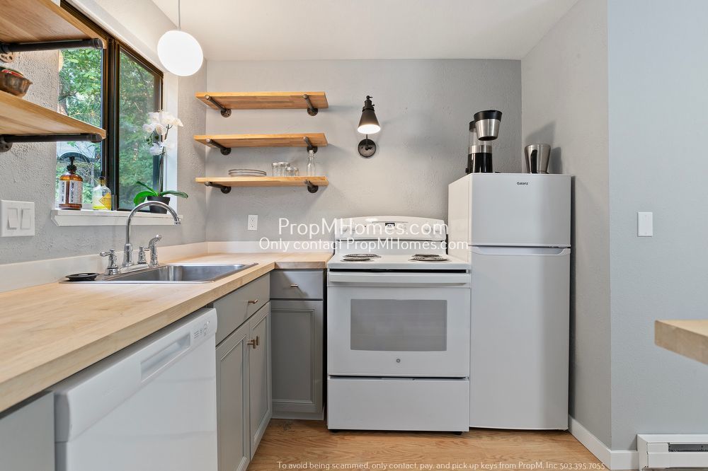 Indulge your culinary passions in a kitchen designed for the modern chef. Flaunting polished wood countertops, handcrafted cabinetry, and pristine white appliances, it's a space where functionality meets artistry. Whether you're a gourmet cook or someone who enjoys quick meals, this kitchen has you covered.