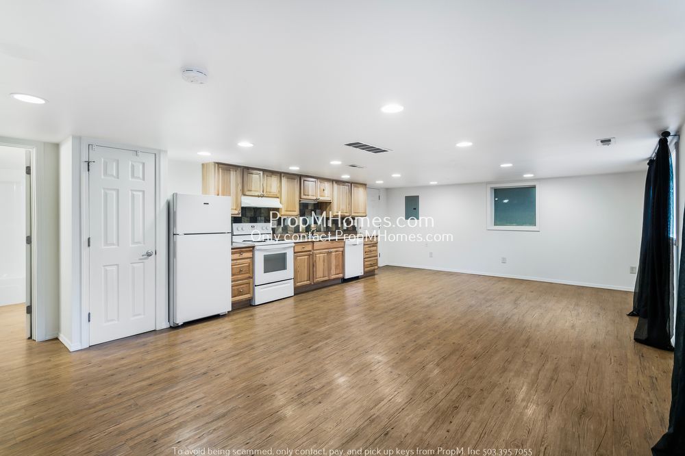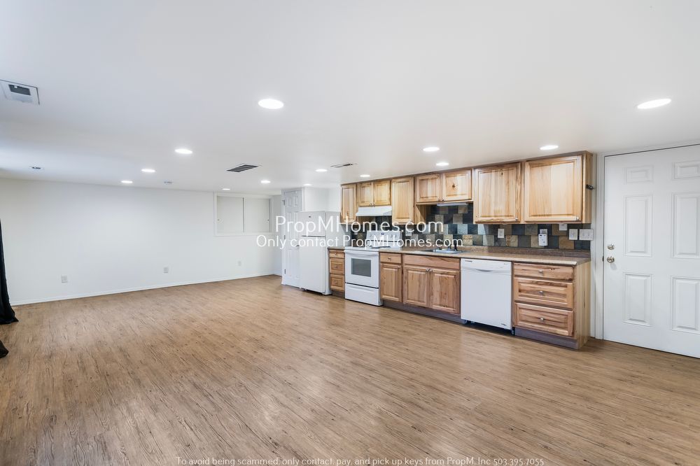 kitchen includes a white stove/oven, dishwasher, and refrigerator — all