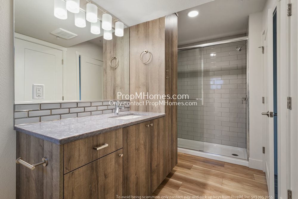 -Stylish bathroom with walk-in shower and large vanity
