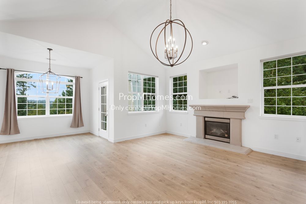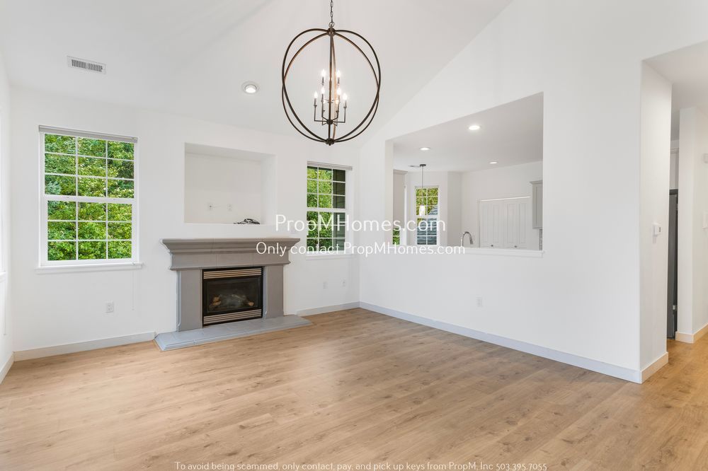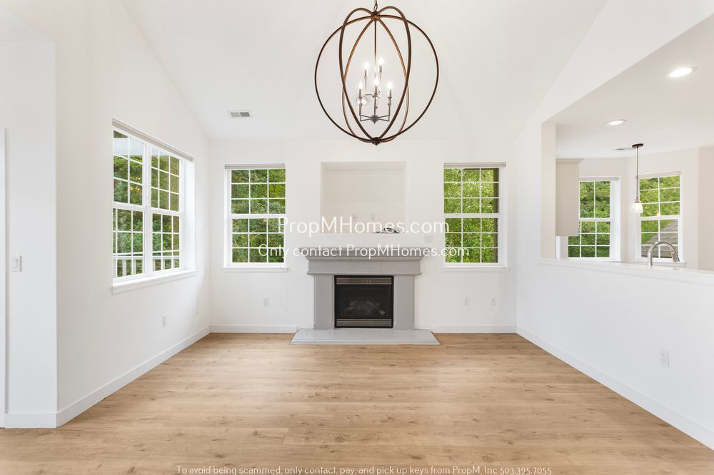 Step into an inviting living space that’s equal parts cozy and stylish. The rich plank flooring exudes warmth, while vaulted ceilings create an airy and spacious atmosphere. Natural light pours in through well-placed windows, enhancing the room's ambiance. For those chilly evenings, gather around the charming gas fireplace—the perfect spot to unwind with a book or host a movie night.