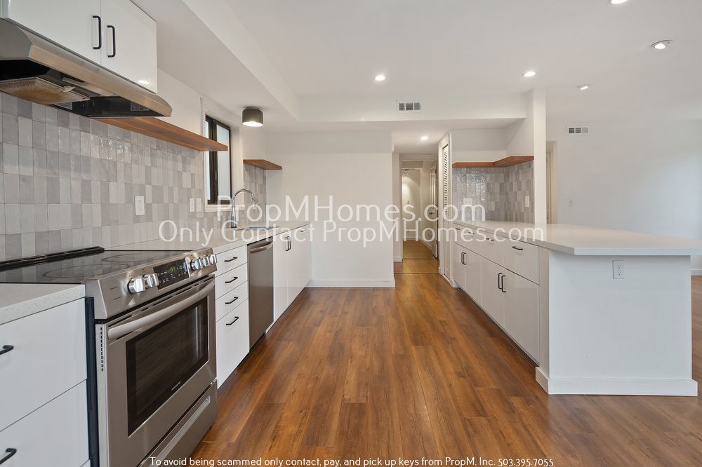 Unleash your culinary creativity in a sleek kitchen featuring white counters, modern white cabinetry, and stainless steel appliances. Equipped with a refrigerator, oven, dishwasher, stove, and microwave, this kitchen is a haven for the aspiring chef or casual cook.