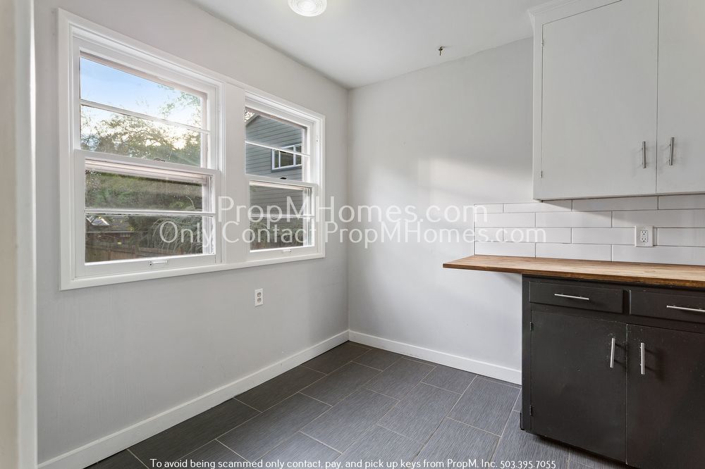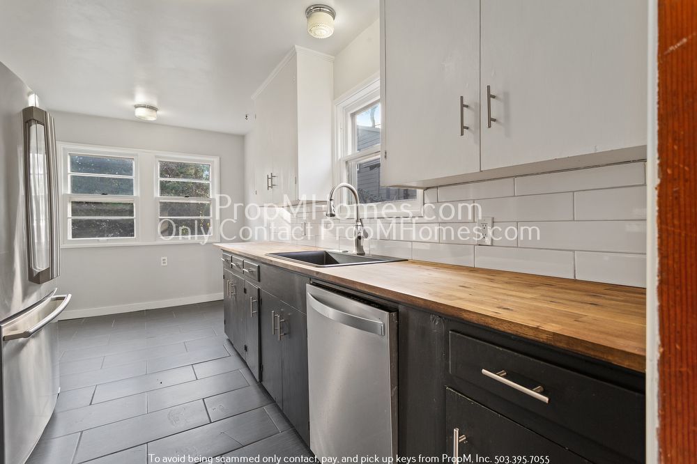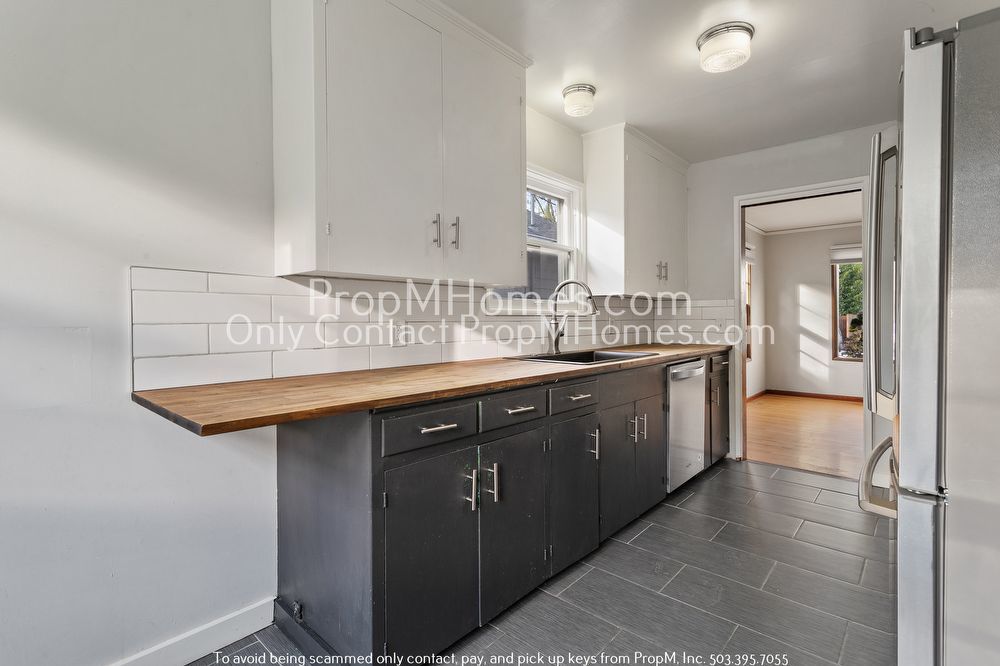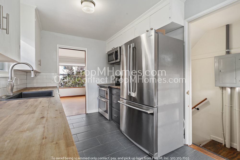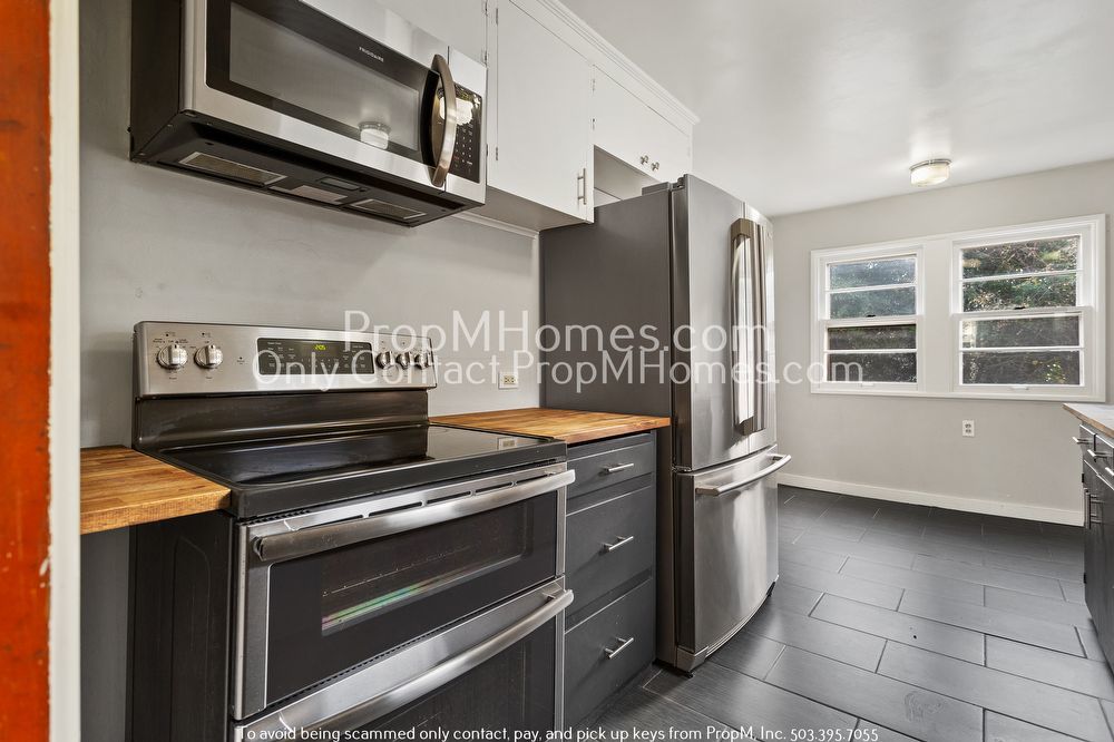 Indulge your culinary senses in a stylish kitchen adorned with butcher block countertops, white cabinetry, and stainless steel appliances. From a refrigerator to an electric stove, every detail is designed for both aesthetics and functionality.