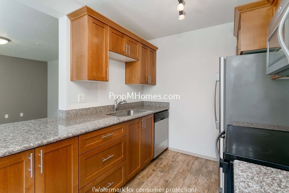 This stunning open galley kitchen is designed with slab granite counters, an eating bar, and custom cabinetry, creating a seamless blend of function and style. It is fully equipped with all stainless appliances, including a microwave, refrigerator, electric range, and dishwasher, catering to all your culinary needs with a touch of modern elegance.