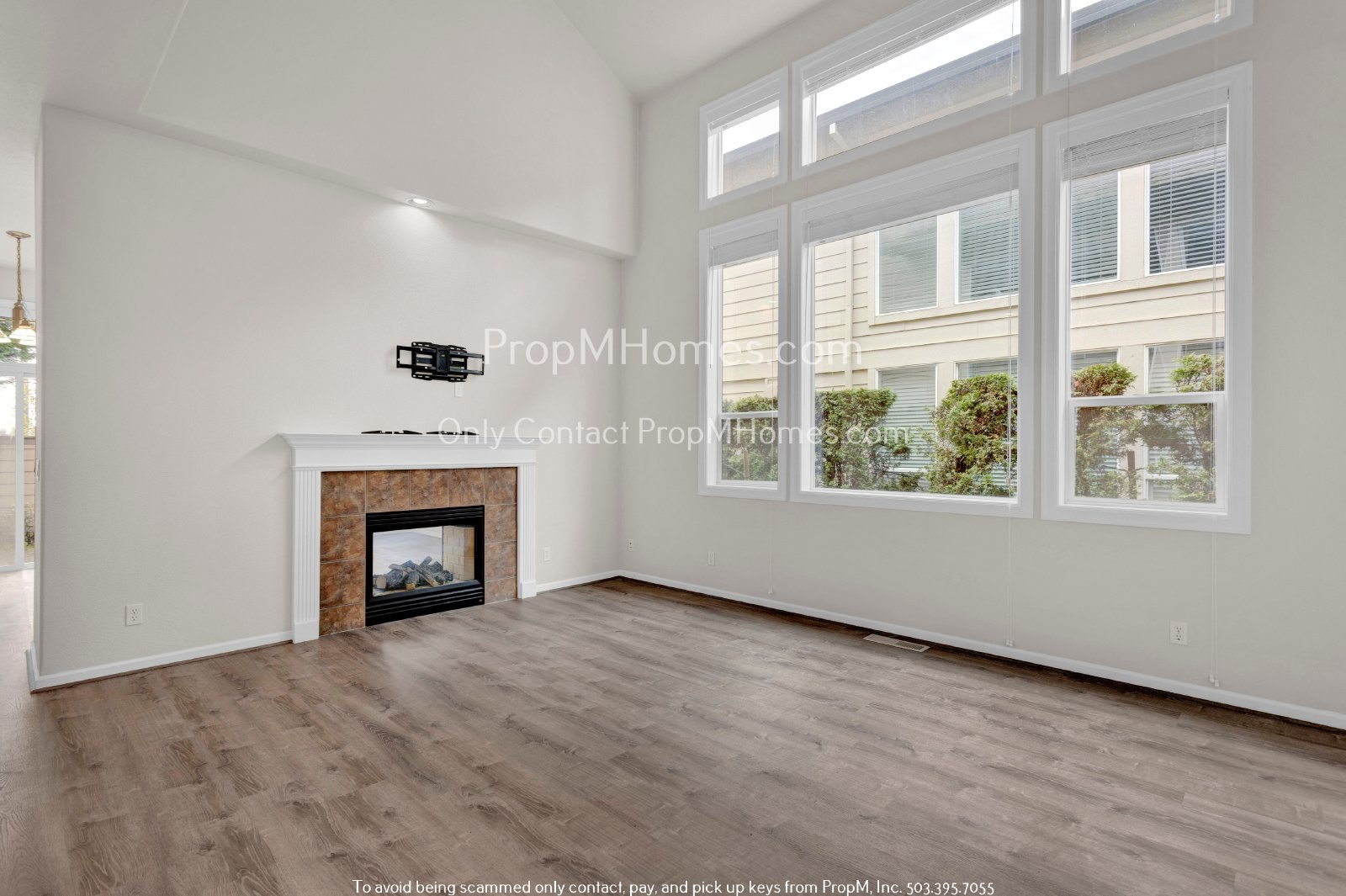 Upon entering this home, you are immediately welcomed by an enchanting courtyard, setting a charming tone. Inside, the living area is anchored by a unique peekaboo glass fireplace, which not only warms the space but also allows light to filter through to the dining area on the other side. The room is outfitted with luxury wood-like flooring that adds warmth and sophistication. Gray-toned walls complement the large windows that flood the area with natural light, enhancing the open and airy feel. Recessed lighting is thoughtfully placed to keep the space bright and inviting, even on the darkest, rainiest days. This living room combines functionality with style, making it the perfect heart of the home.