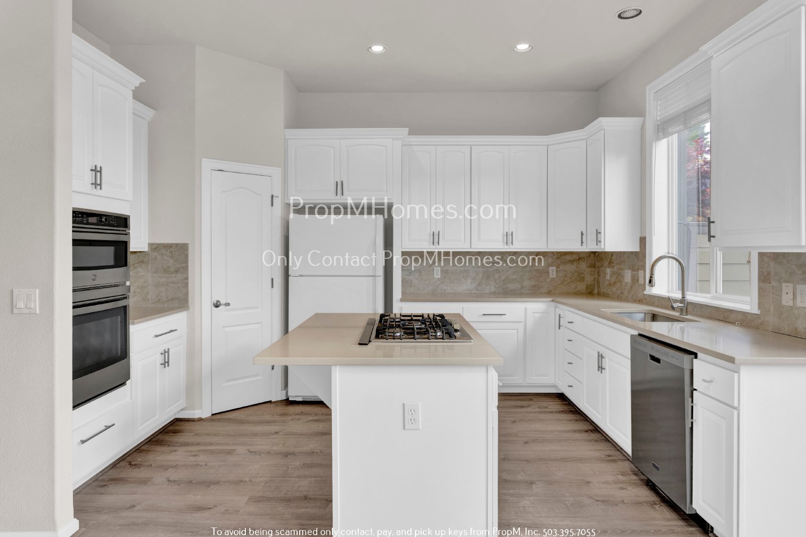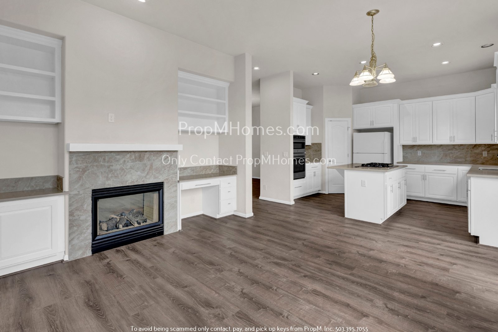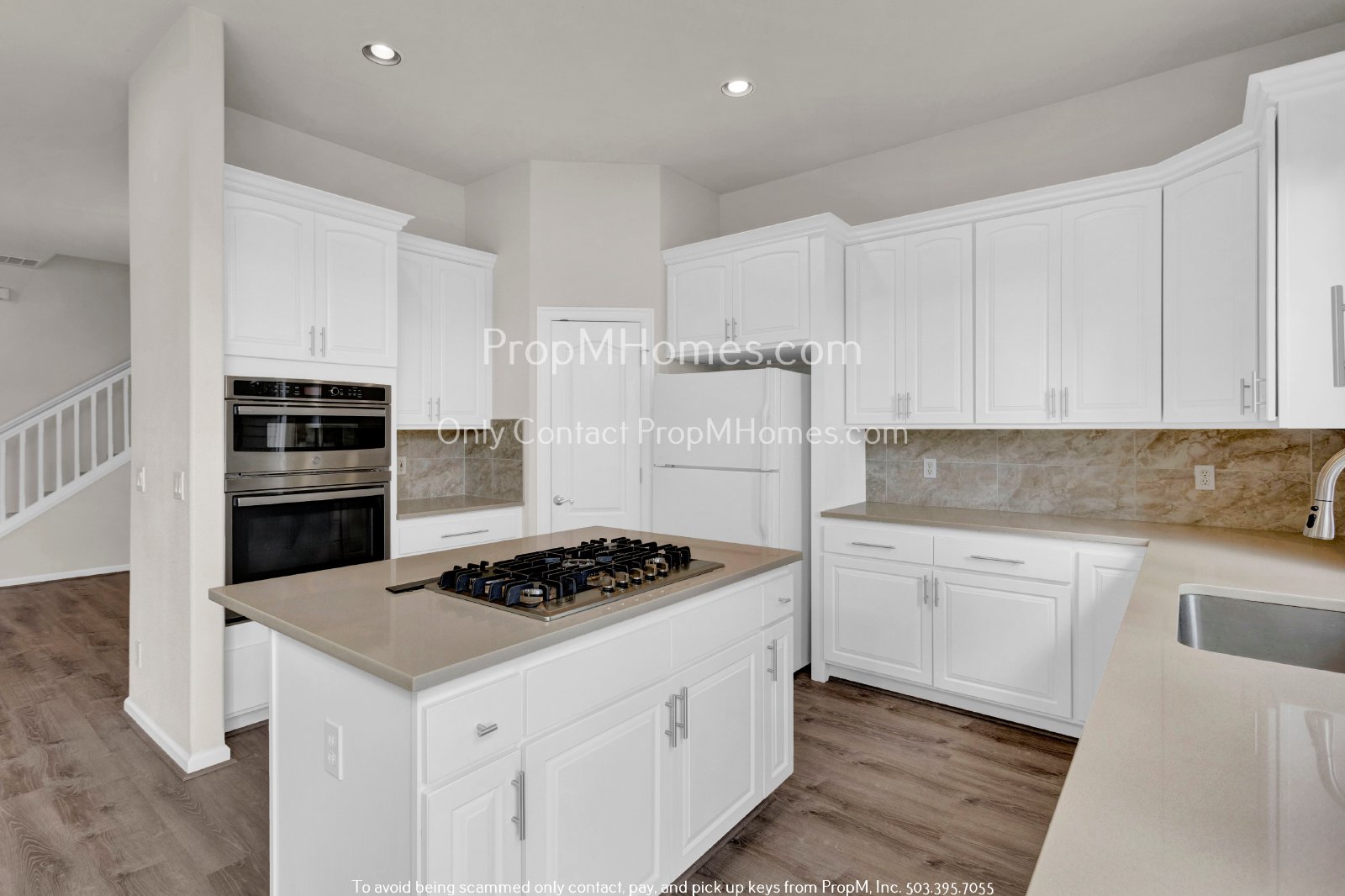 This kitchen, seamlessly connected to the main living area and a formal dining room adorned with lovely built-in shelving and a cozy fireplace, radiates warmth and functionality. It features crisp white cabinets and is equipped with high-end appliances, including dual-stacked ovens, a gas stovetop, a dishwasher, and a refrigerator. The quartz countertops and tile backsplash add a touch of elegance, harmonizing beautifully with the luxury wood-like flooring that extends throughout. This thoughtfully designed kitchen not only meets all culinary needs but also serves as a stylish gathering space for dining and entertaining.