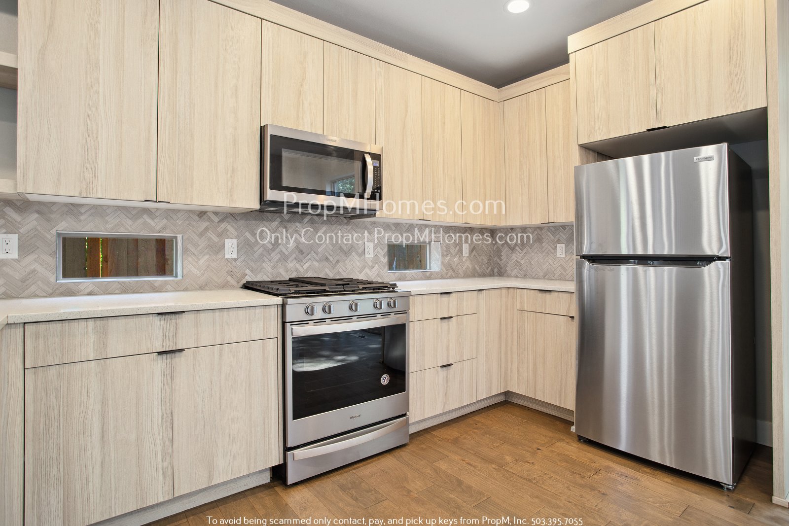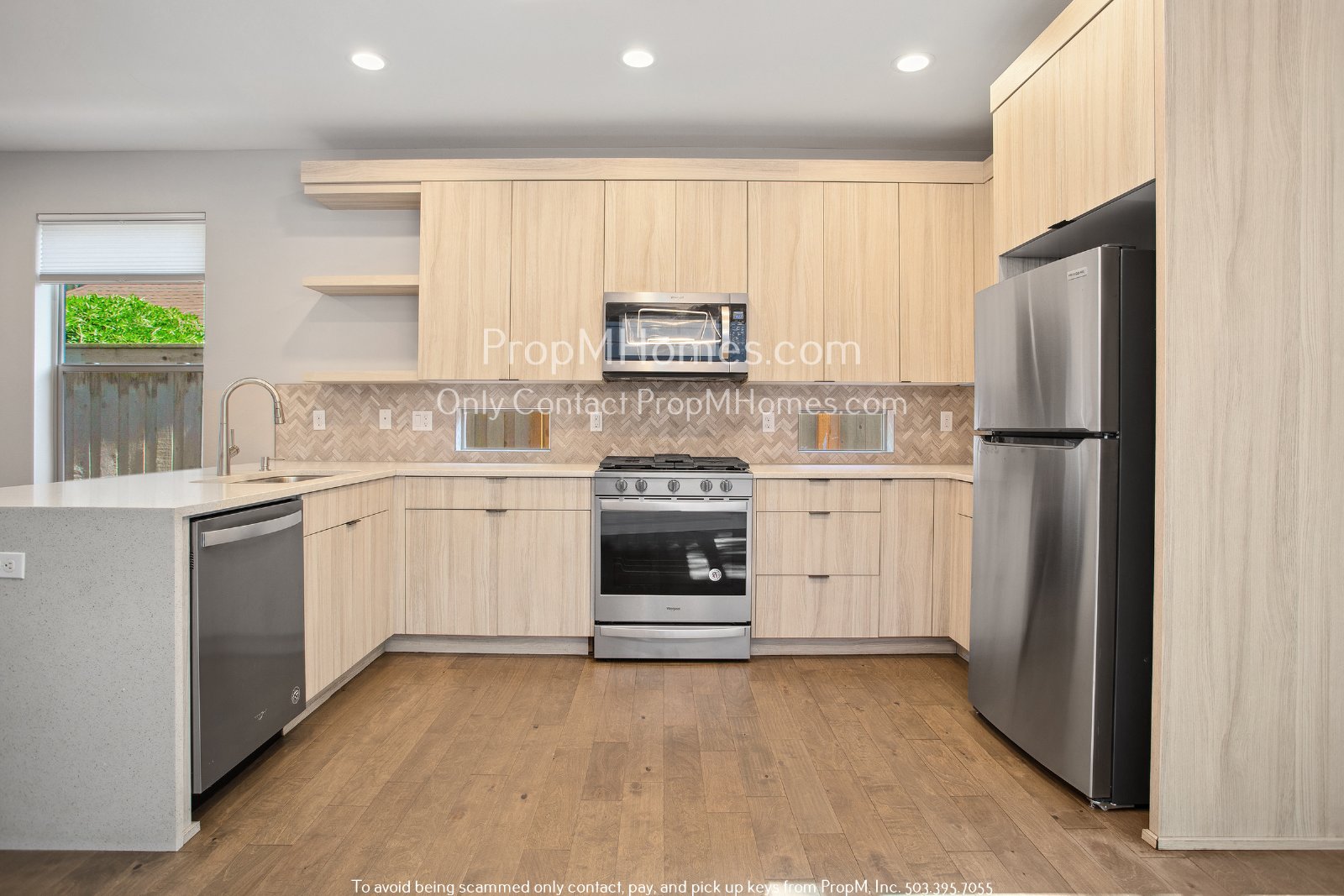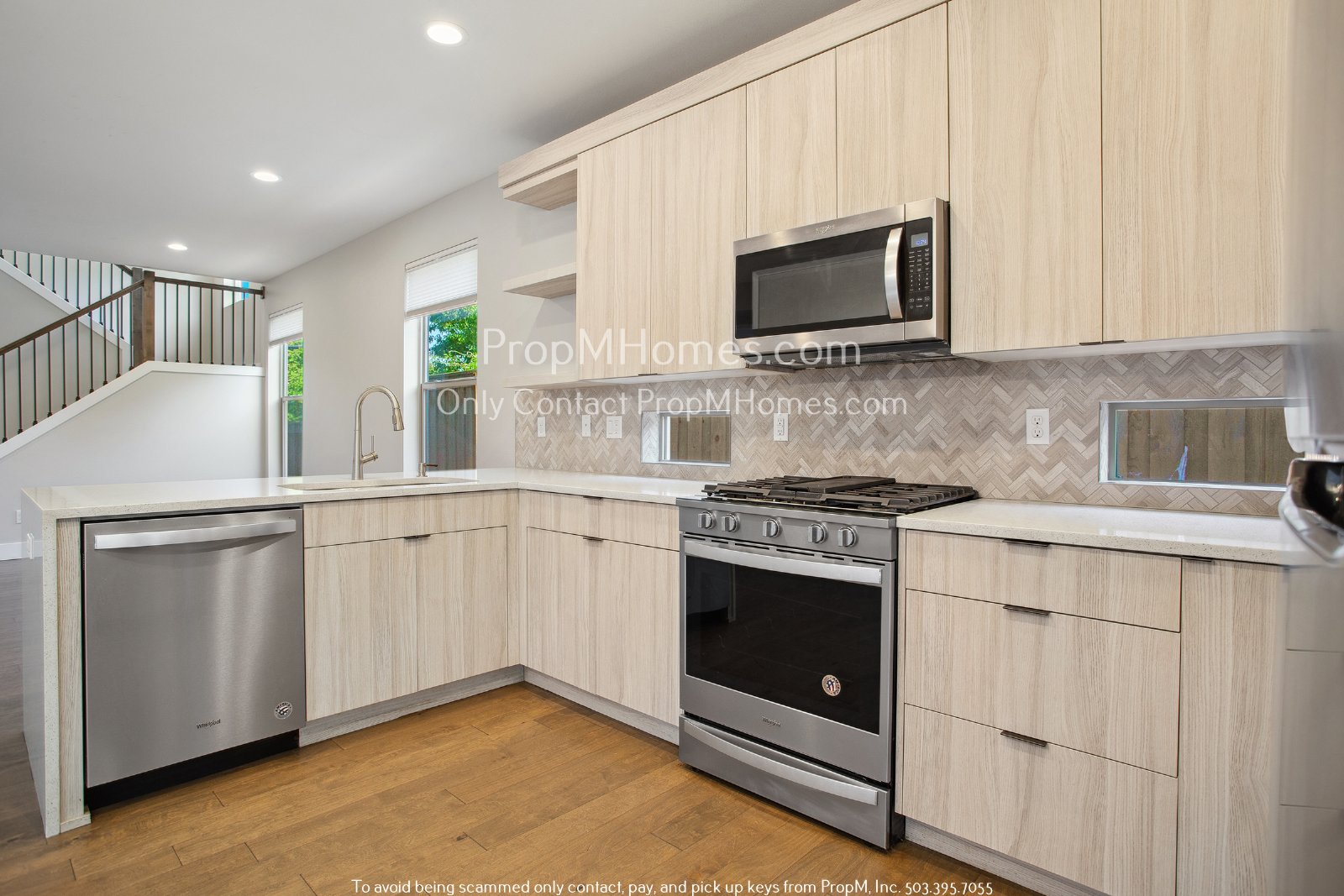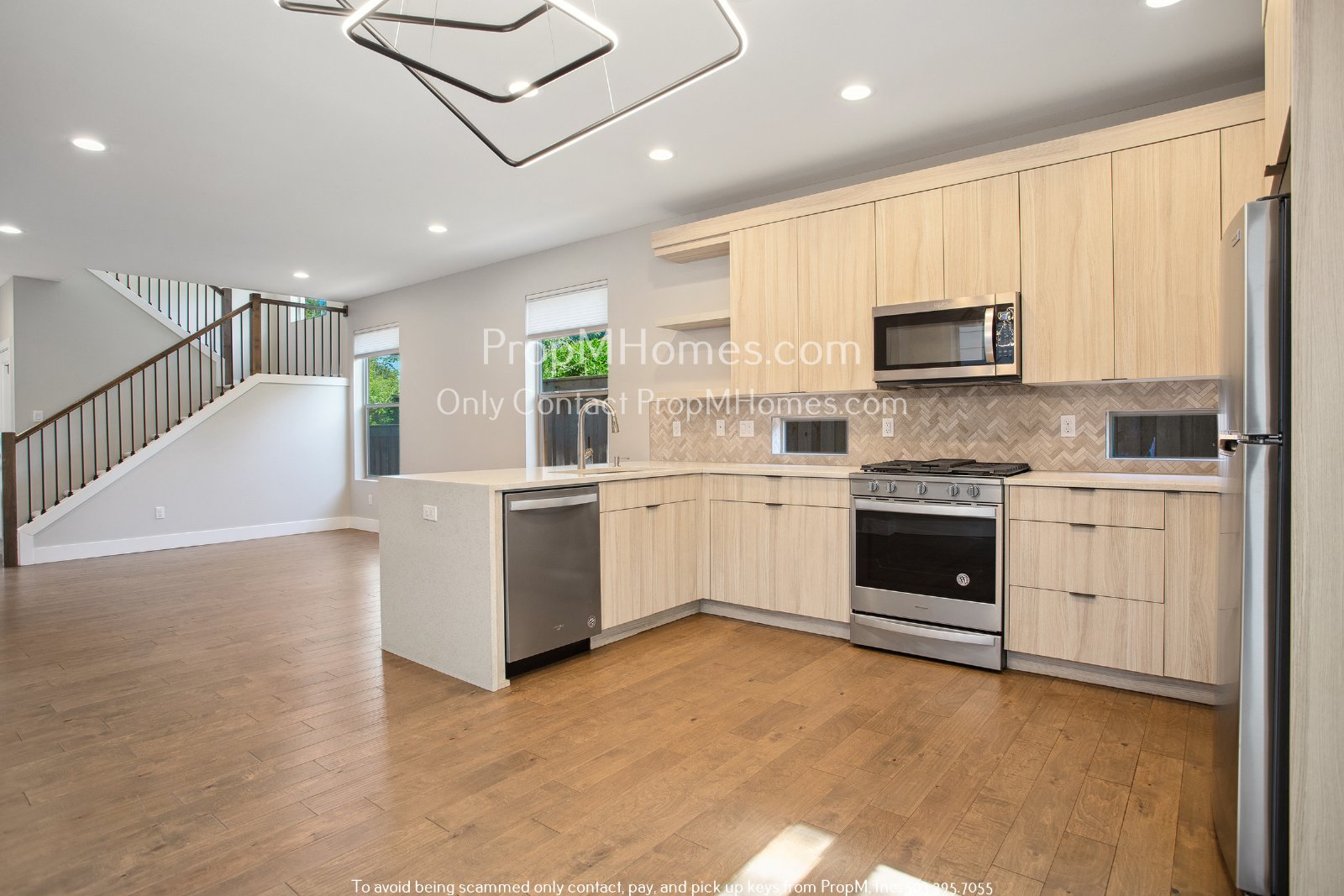 This stunning kitchen boasts a unique tiled backsplash that adds a truly striking element to the space. The light wood-grained cabinets, in muted tones, provide ample storage while enhancing the kitchen's elegant aesthetic. Equipped with stainless steel appliances, including a gas range/oven combo, dishwasher, refrigerator/freezer, and built-in microwave, this kitchen is both functional and stylish. Modern light fixtures and well-placed windows allow for plenty of natural light, creating a refreshing, almost nature-like ambiance. The quartz countertops not only offer durability but also contribute to the room's bright and inviting atmosphere. Additionally, the cabinets feature a built-in shelf on the corner, adding a touch of aesthetic appeal to this beautifully designed space.