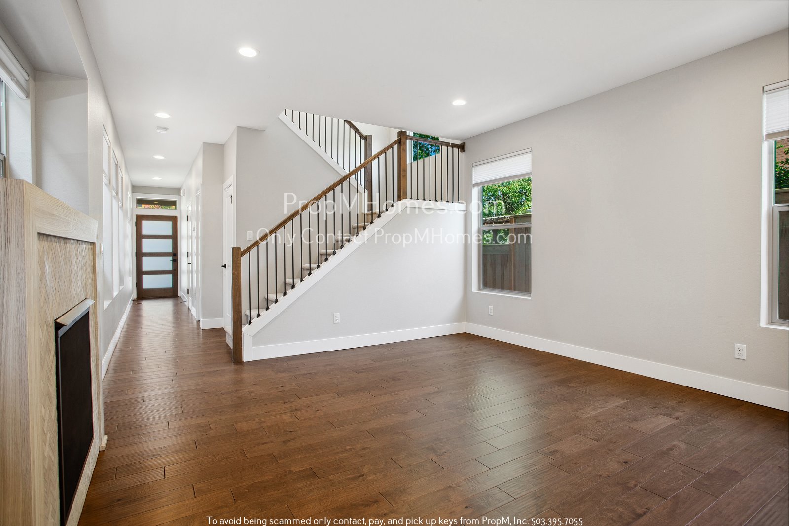 This home welcomes you with beautiful hardwood flooring and an entryway lined with windows, bathing the space in natural light. At its heart, a stunning tiled fireplace serves as a cozy focal point, flanked by built-ins for added storage and display. The walls are painted a muted gray, providing a sophisticated backdrop. The living space features an abundance of windows, creating a light and airy feel, and the open-concept design ensures a seamless flow from the living area to the kitchen and dining space, perfect for both everyday living and entertaining.