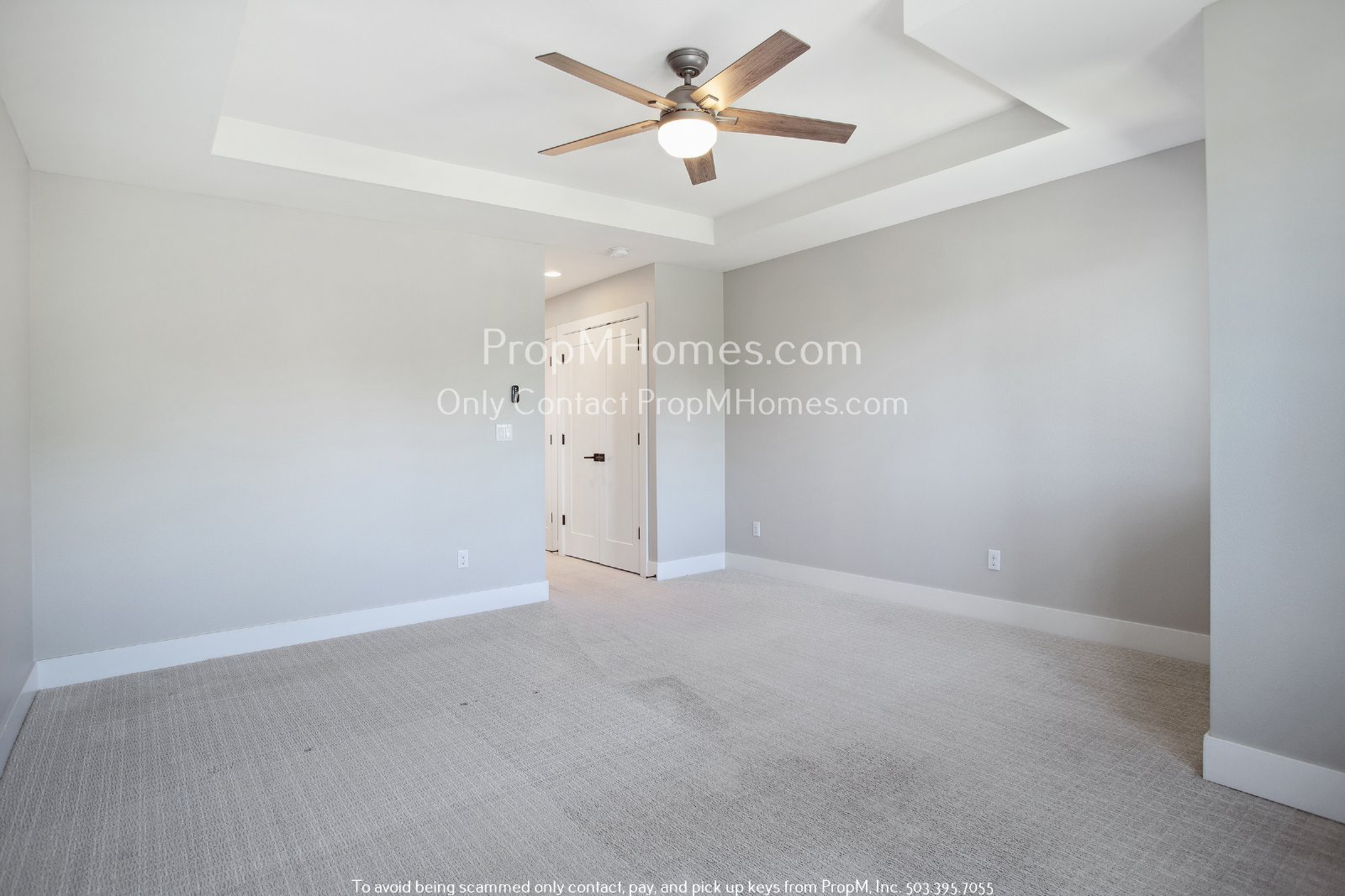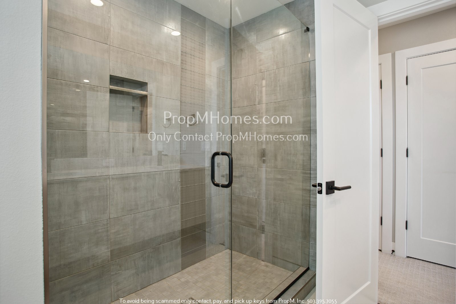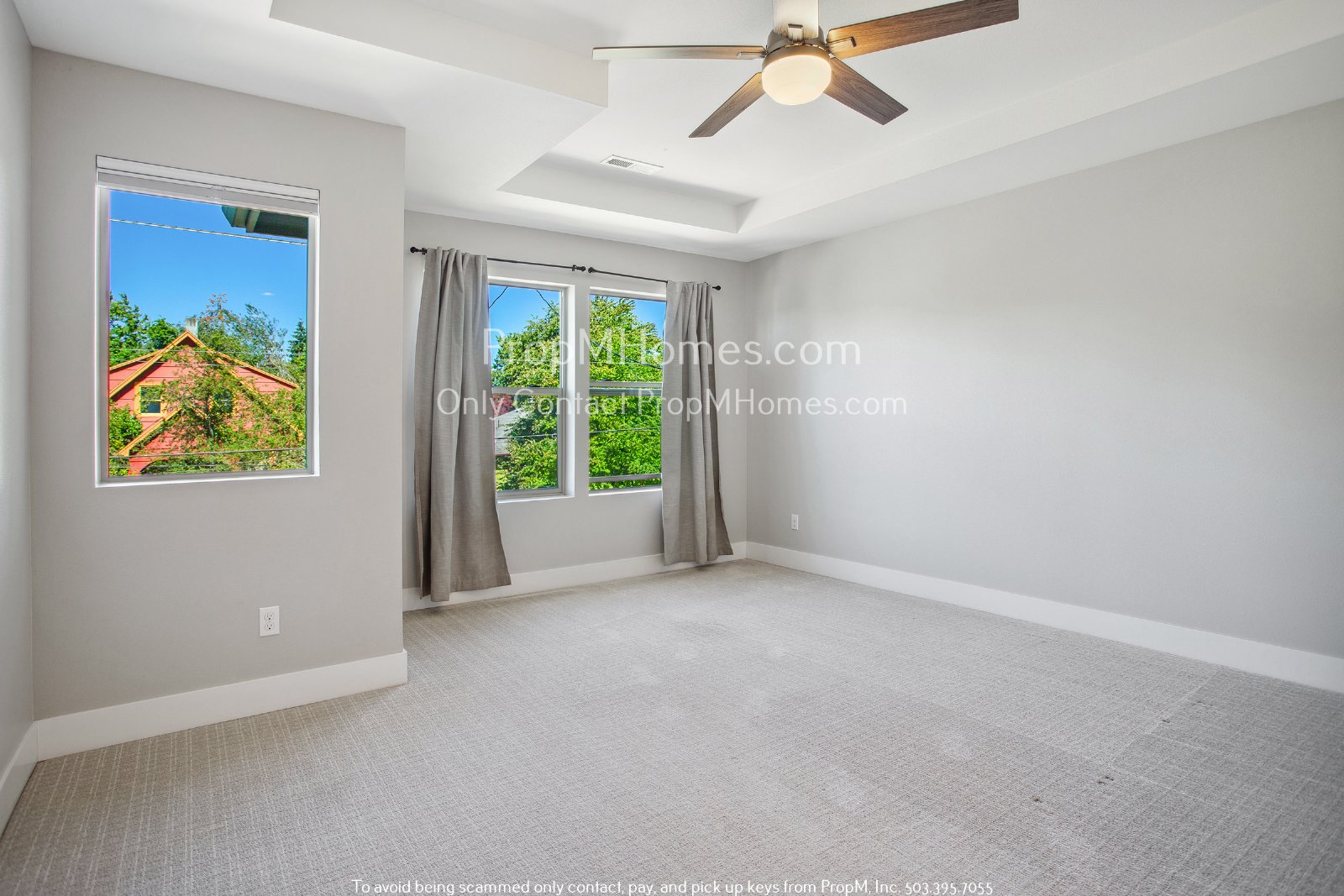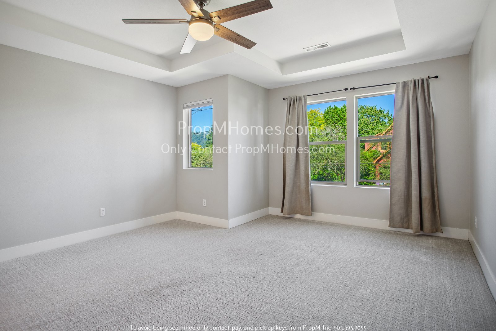 This home offers three bedrooms and two and a half bathrooms, each thoughtfully painted in a muted modern gray tone. Every bedroom features white baseboards, plush carpeting, and windows that fill the rooms with natural light. The hallway bathroom includes a convenient tub/shower combo, perfect for family and guests. The primary bedroom stands out with its tall ceilings, large windows, and a ceiling fan, creating an airy and spacious feel. It also boasts its own dedicated bathroom with a walk-in shower, providing a private and luxurious retreat.