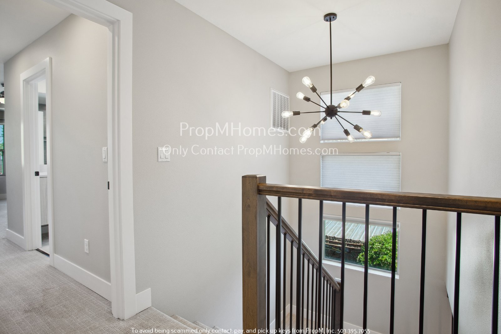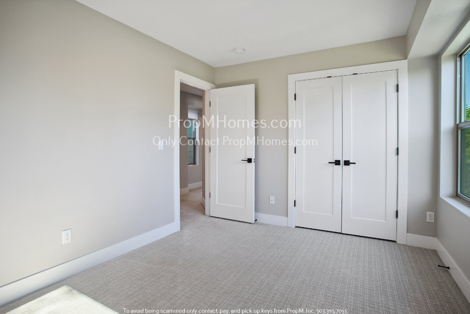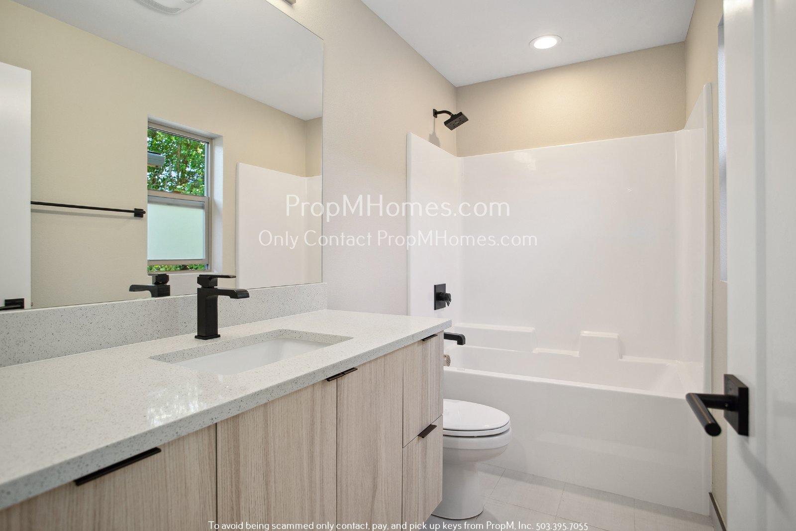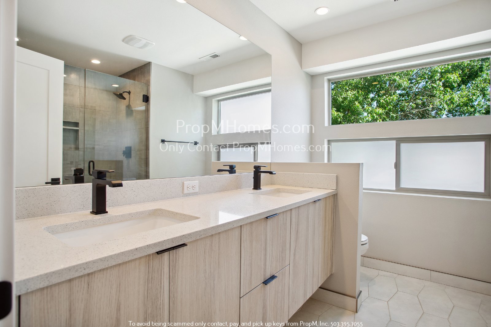 This home offers three bedrooms and two and a half bathrooms, each thoughtfully painted in a muted modern gray tone. Every bedroom features white baseboards, plush carpeting, and windows that fill the rooms with natural light. The hallway bathroom includes a convenient tub/shower combo, perfect for family and guests. The primary bedroom stands out with its tall ceilings, large windows, and a ceiling fan, creating an airy and spacious feel. It also boasts its own dedicated bathroom with a walk-in shower, providing a private and luxurious retreat.