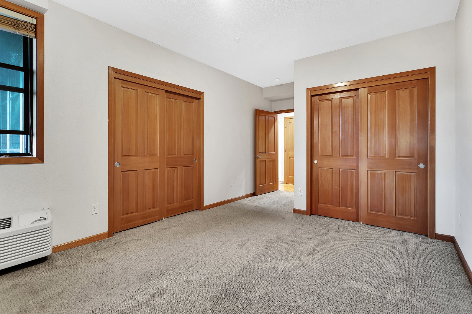 The spacious one-bedroom offers large windows with elegant wood trim throughout, filling the room with natural light and charm. Adjacent to the bedroom is the bathroom, featuring a convenient shower/tub combination. Double closets provide ample storage, ensuring plenty of space to keep belongings organized and easily accessible.