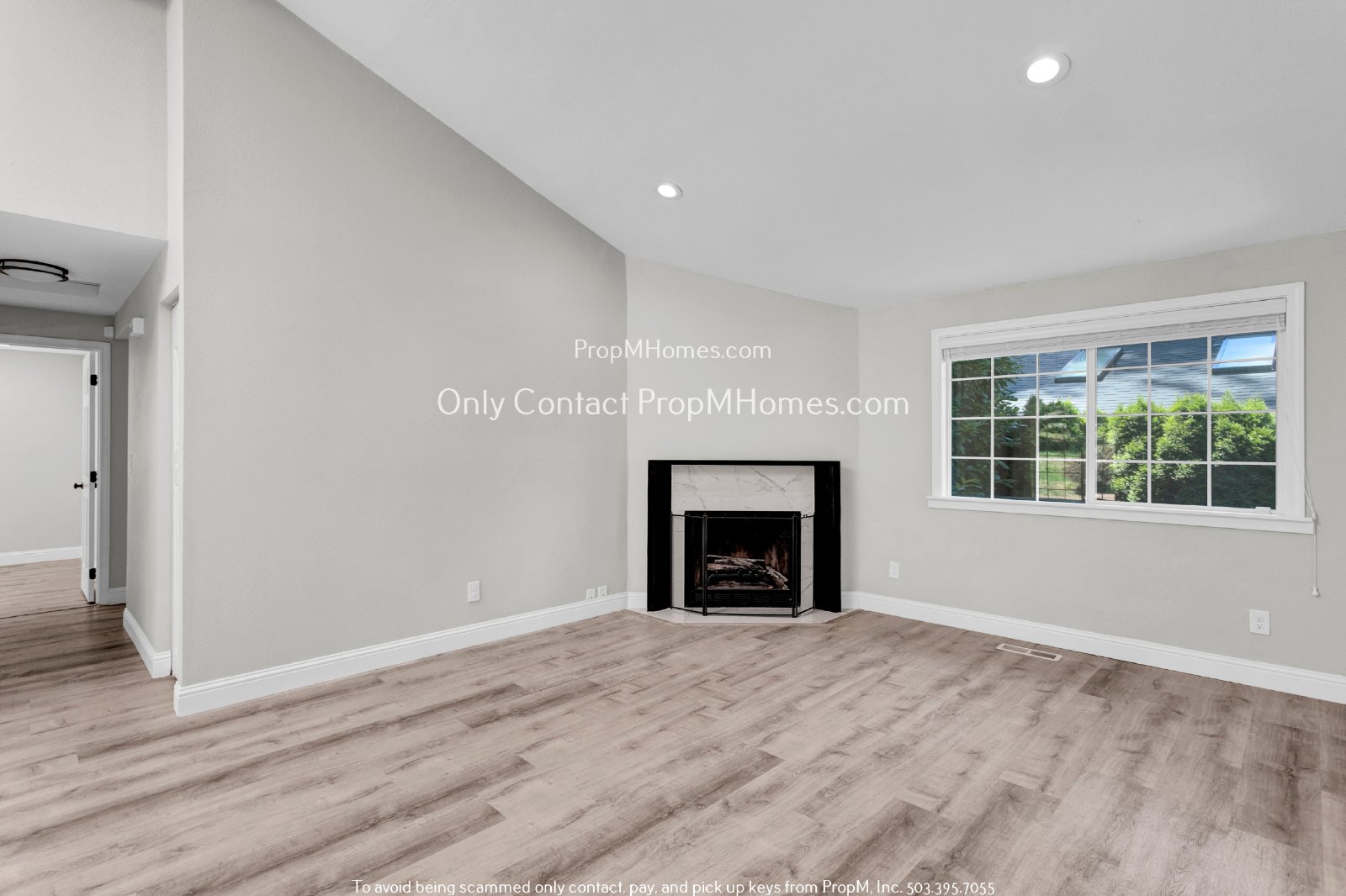 Step into the inviting living area of this home, where luxury laminate flooring greets you underfoot and walls painted in a muted gray tone offer a perfect canvas for your personal style. At the heart of the space, a gas fireplace adds warmth and charm, while large windows flood the room with natural light, creating a bright and welcoming ambiance.