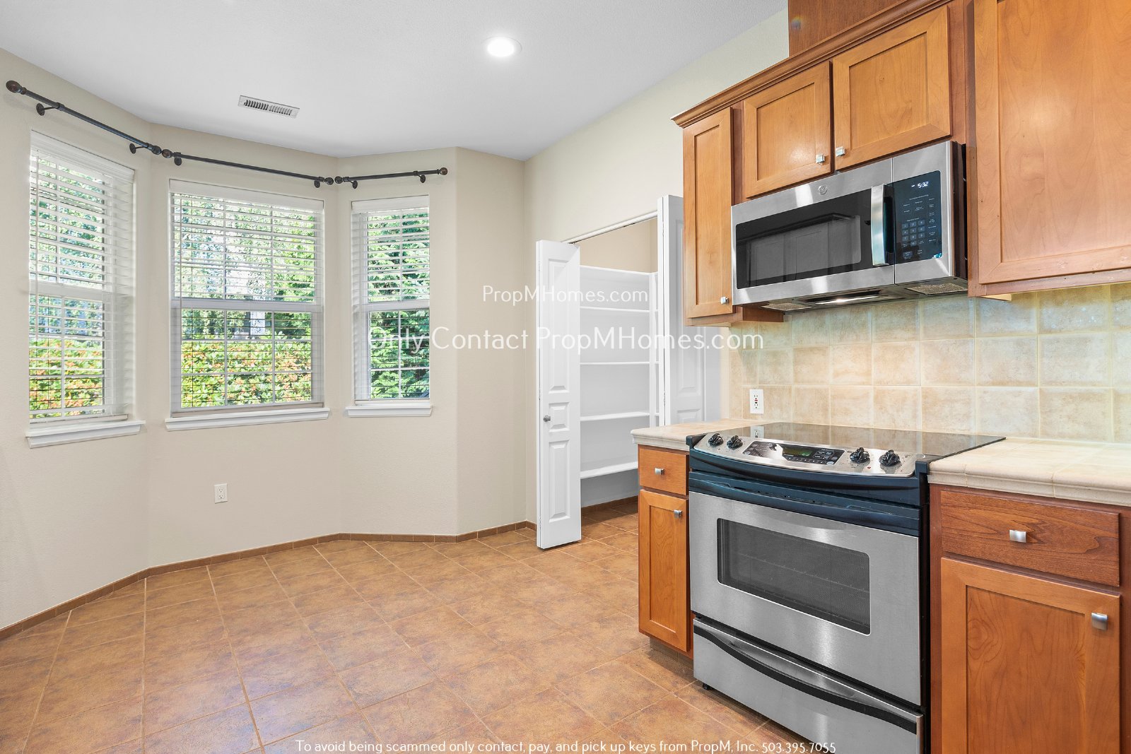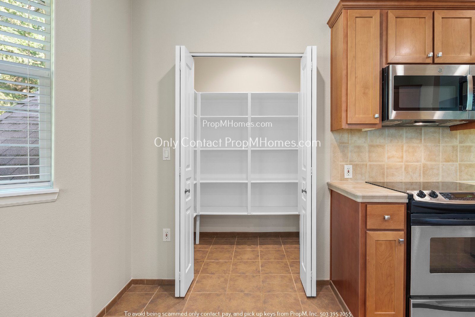 The kitchen boasts ample cabinet space and a pantry, providing plenty of storage for all your culinary needs. Equipped with stainless steel appliances, including a side-by-side refrigerator, glass-top oven and range, built-in microwave, and dishwasher, this kitchen combines functionality with style. The tile backsplash adds a touch of elegance, making this a perfect space for both cooking and entertaining.