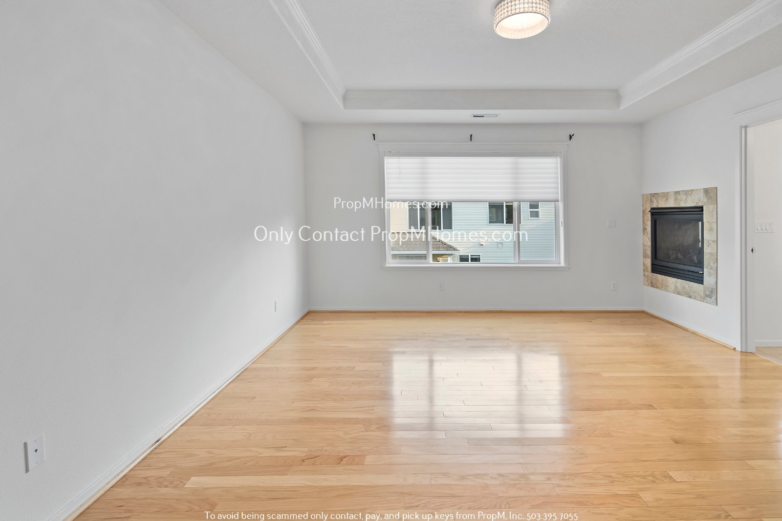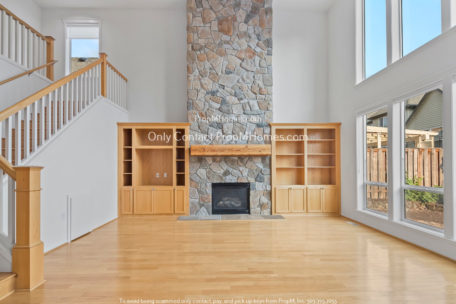 Step into this inviting living room, where you're greeted by the warmth of gleaming hardwood floors underfoot, setting the tone for a cozy and elegant space. Expansive windows flood the room with natural light, creating a bright and airy atmosphere that feels both welcoming and serene. At the heart of the room, a gas fireplace stands ready to chase away the chill of winter, offering both warmth and a focal point for gatherings. The tall ceilings enhance the sense of openness, while built-in shelving provides stylish and convenient storage, making it easy to keep the space tidy and organized. This living room is a perfect blend of comfort and sophistication, designed to be the heart of your home.