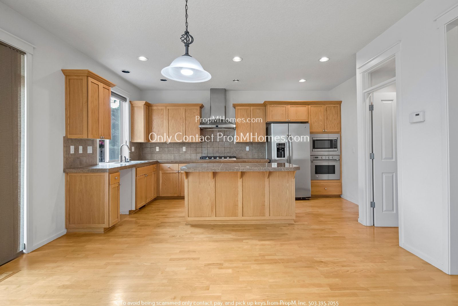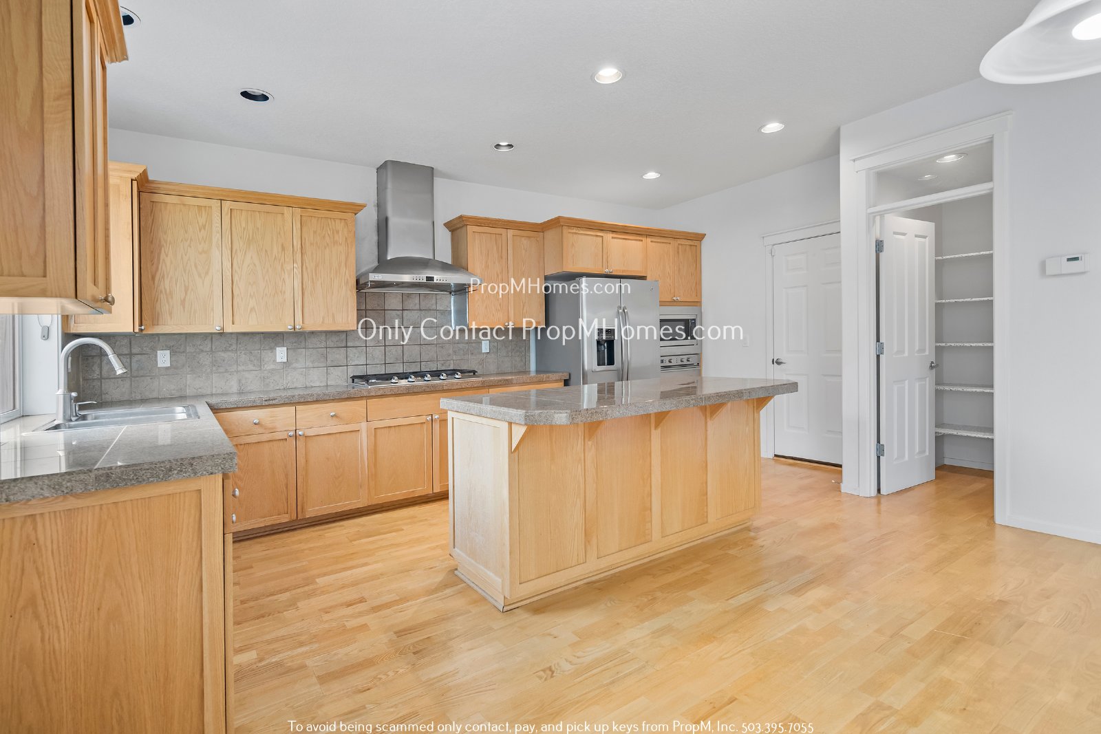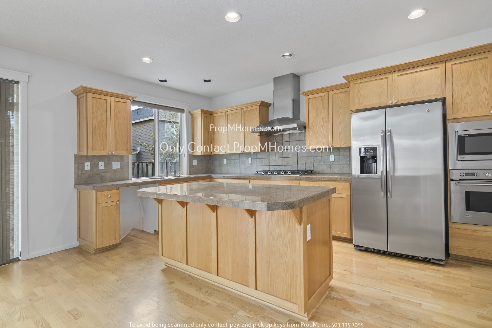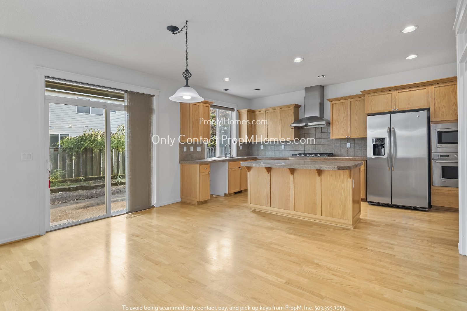 Welcome to the heart of the home—a kitchen designed with both functionality and family gatherings in mind. The open-concept layout seamlessly connects the kitchen, dining, and living areas, making it the perfect space for family meals and entertaining guests. This kitchen boasts stunning stainless steel appliances, including a gas range and oven, accompanied by a sleek side-by-side refrigerator, and built-in microwave. Dishwasher included, you'll find no shortage of storage with ample oak cabinetry, allowing you to keep your kitchen essentials neatly organized. A kitchen island serves as a cozy breakfast nook, ideal for quick bites or morning coffee. Just off the dining area, a lovely patio offers an inviting outdoor space for al fresco dining or relaxation. The kitchen is made complete by a generously sized pantry, providing plenty of room for all your culinary needs.