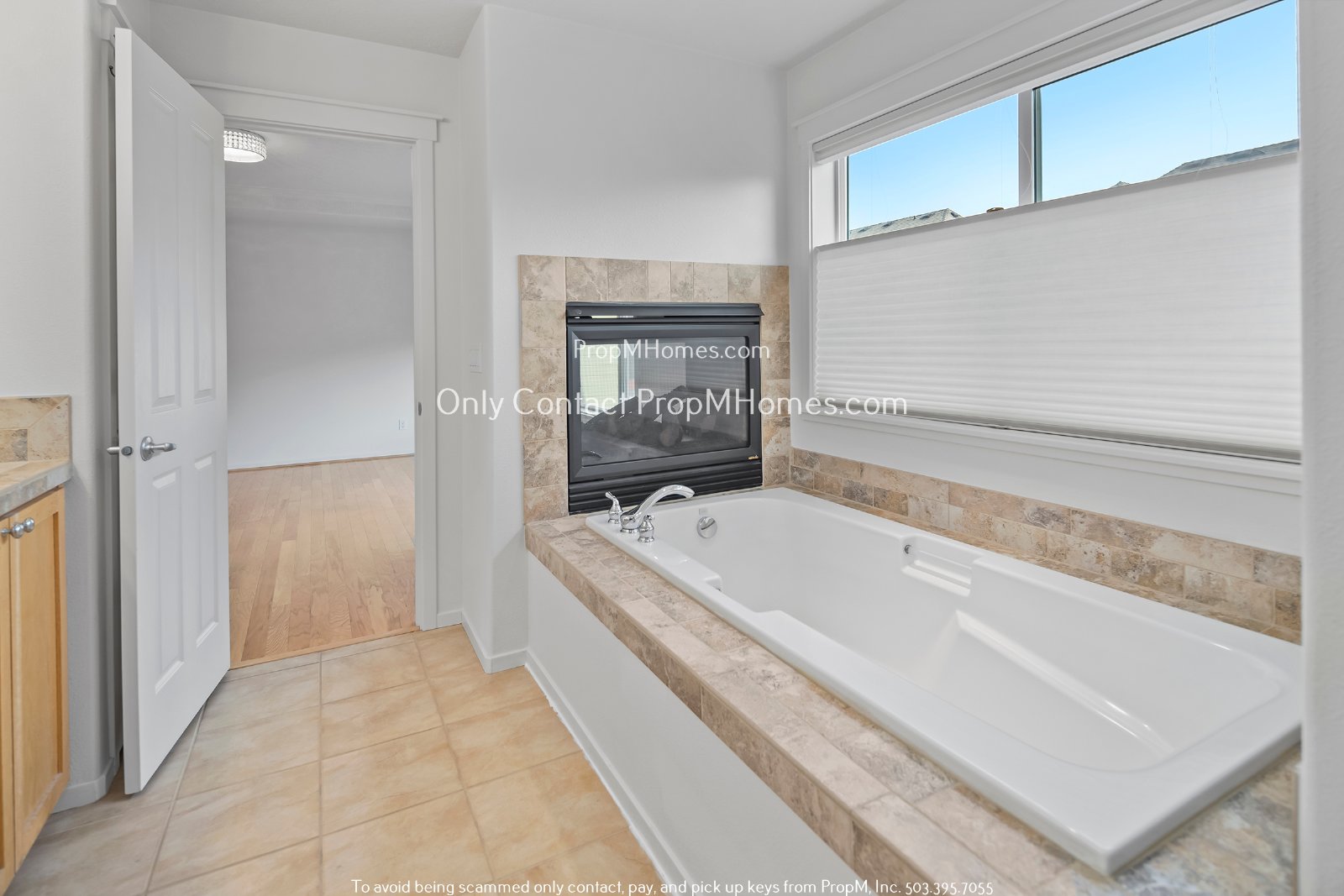 This home features thoughtfully adorned in a muted white tone, creating a serene backdrop perfect for your personal touch. The primary bedroom is a true retreat, offering a spacious walk-in closet and an en-suite bathroom designed for relaxation and luxury. The bathroom is complete with a soothing soaking tub and an outstanding fireplace that offers a unique peek-through view, connecting the warmth and elegance of the bedroom with the bathroom. This thoughtful design element adds a touch of sophistication, making the primary suite a tranquil haven within the home. The additional bedrooms provide ample space and versatility, ideal for family, guests, or even a home office. Each bathroom is designed with simplicity and style in mind, ensuring comfort and convenience for all who reside here.