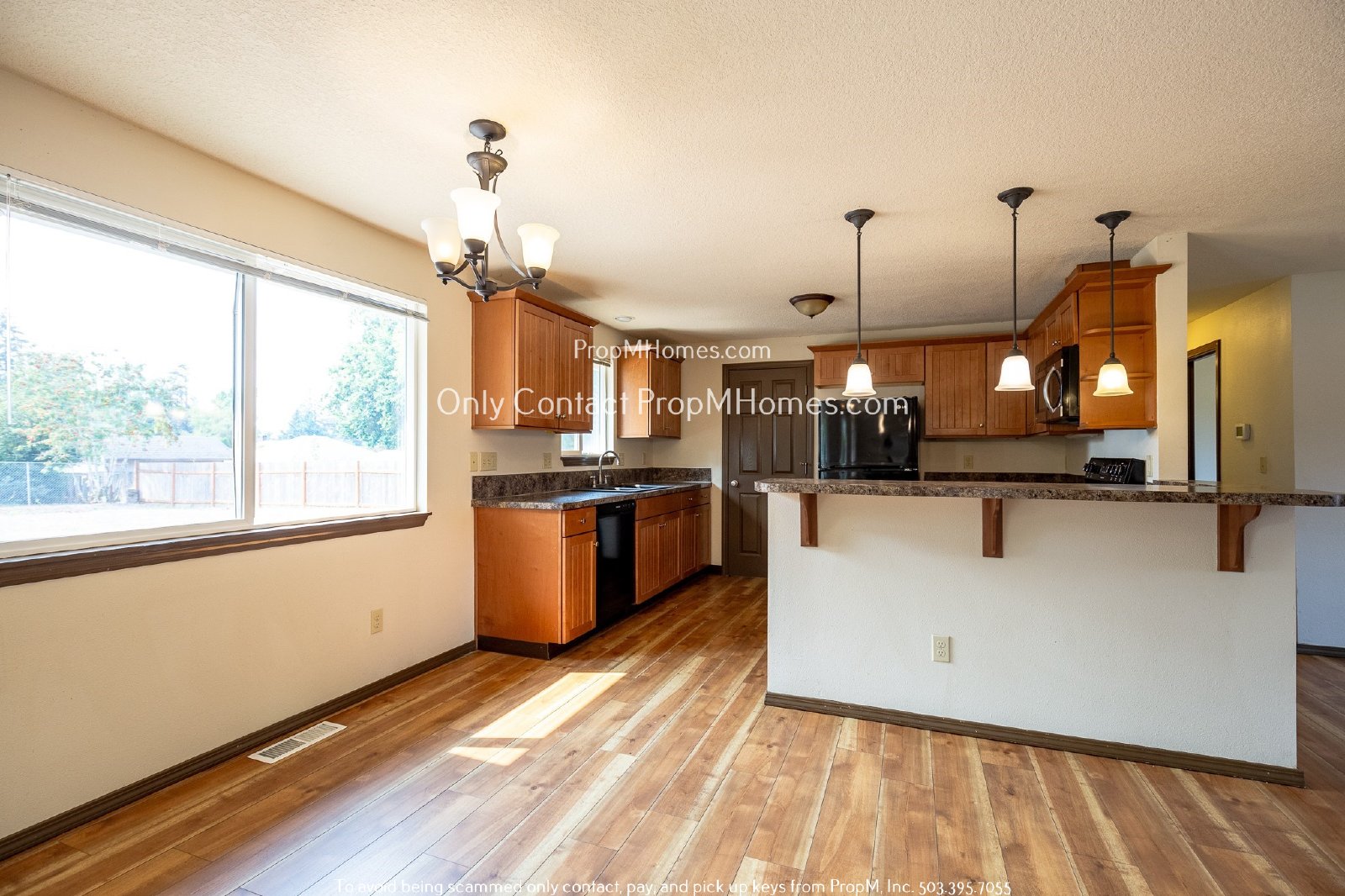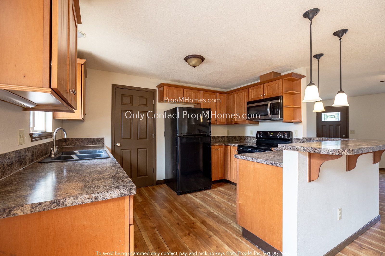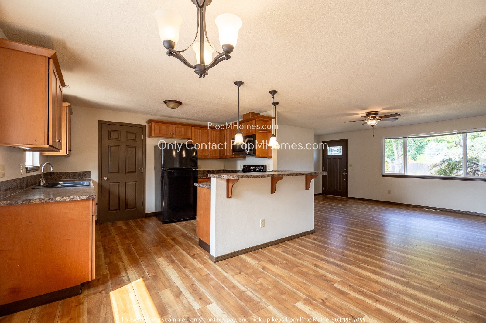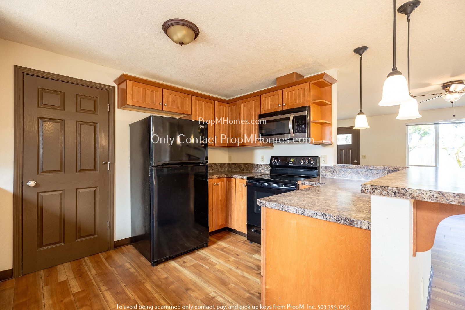 This kitchen is designed for both functionality and style, offering ample cabinet space to keep all your essentials neatly organized. The sleek black appliances, including a glass-top oven/range, dishwasher, microwave, and refrigerator, add a modern touch to the space. A convenient kitchen bar provides the perfect spot for casual meals or entertaining. Just off the kitchen, you'll find the dining room, seamlessly connecting the spaces for easy flow and convenience.