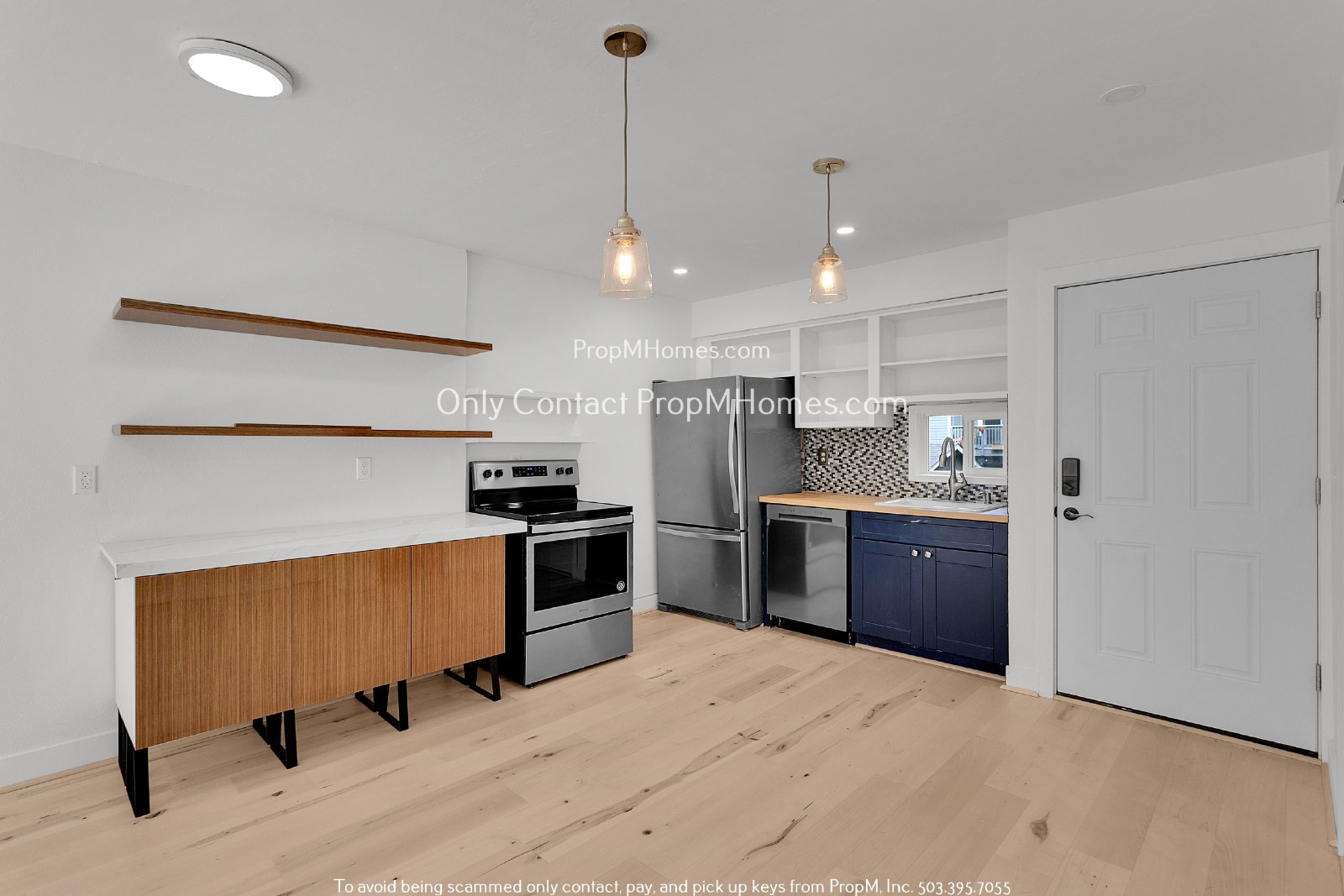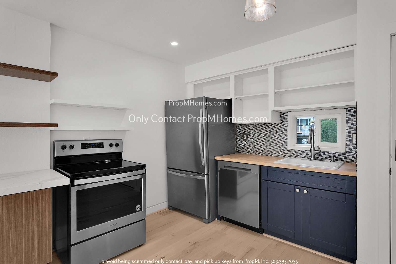 This kitchen is a chef's dream, outfitted with sleek stainless steel appliances, including a brand-new dishwasher and a refrigerator featuring an icemaker. The maple-engineered hardwood flooring pairs beautifully with the butcher block countertops, creating a clean and modern aesthetic. With ample cabinetry providing excellent storage space, this kitchen is as functional as it is stylish.