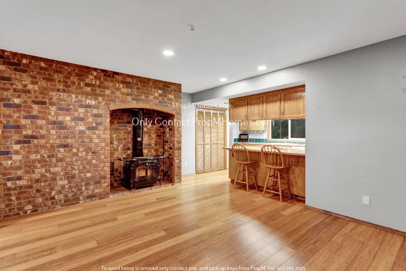 The kitchen and dining area offer a perfect blend of style and function. Adjacent to the kitchen, the dining space is large enough to accommodate a formal dining area or a more intimate seating arrangement. Hardwood flooring continues through this area, complementing the warmth of a wood stove set against a charming rock accent wall. The kitchen itself features oak cabinets providing ample storage, as well as electric appliances including a glass stove top/oven combo, refrigerator, and dishwasher. A convenient kitchen bar offers seating, making it an ideal spot for quick meals or casual dining.