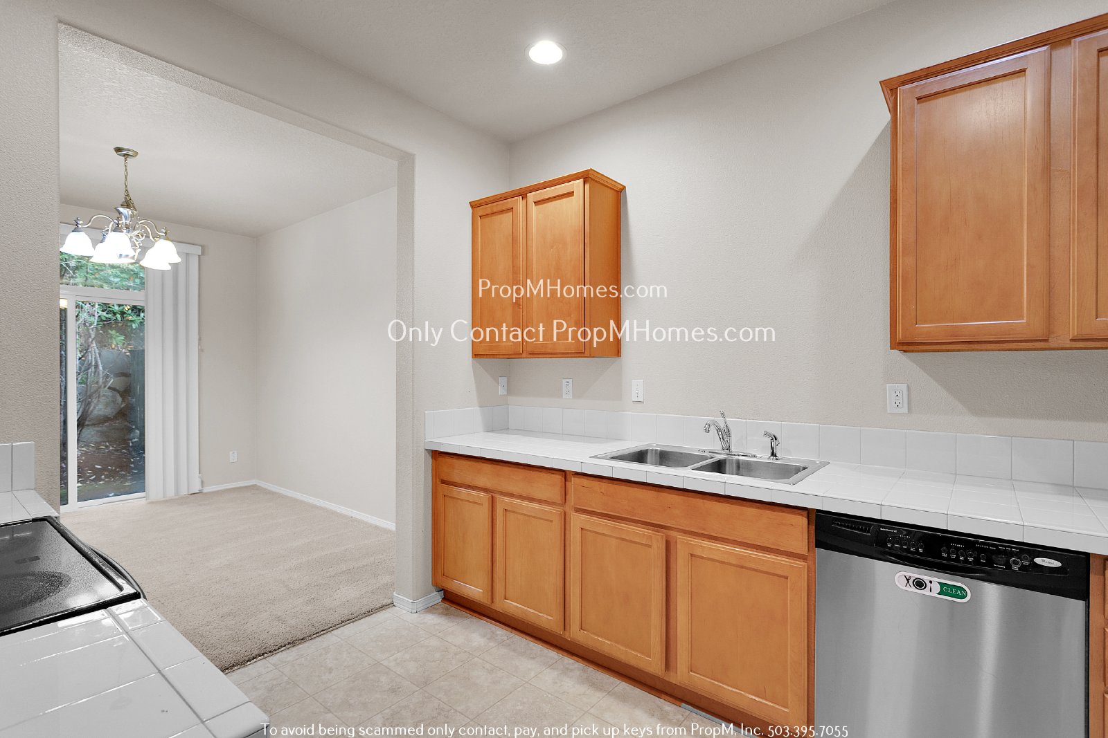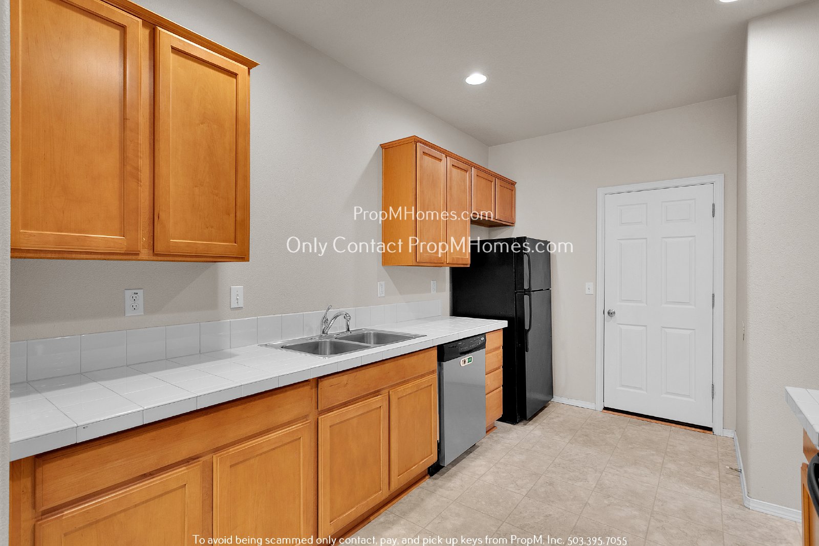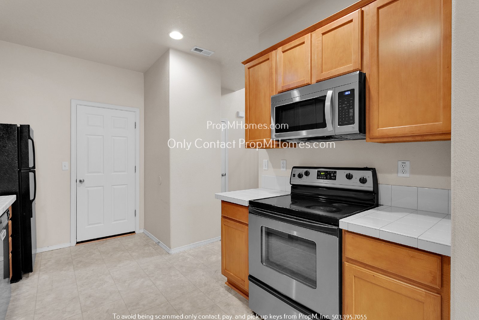 The kitchen is designed for both functionality and elegance, featuring light wood cabinetry and beautiful tile counters. Stainless steel appliances add a modern touch, making this kitchen a joy to cook in. You’ll find all the essentials here, including an electric stove, microwave, dishwasher, and a sleek black refrigerator.