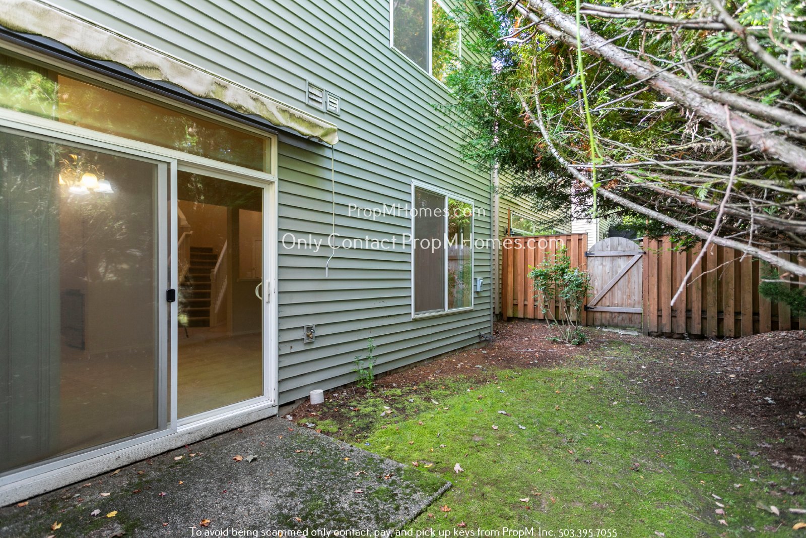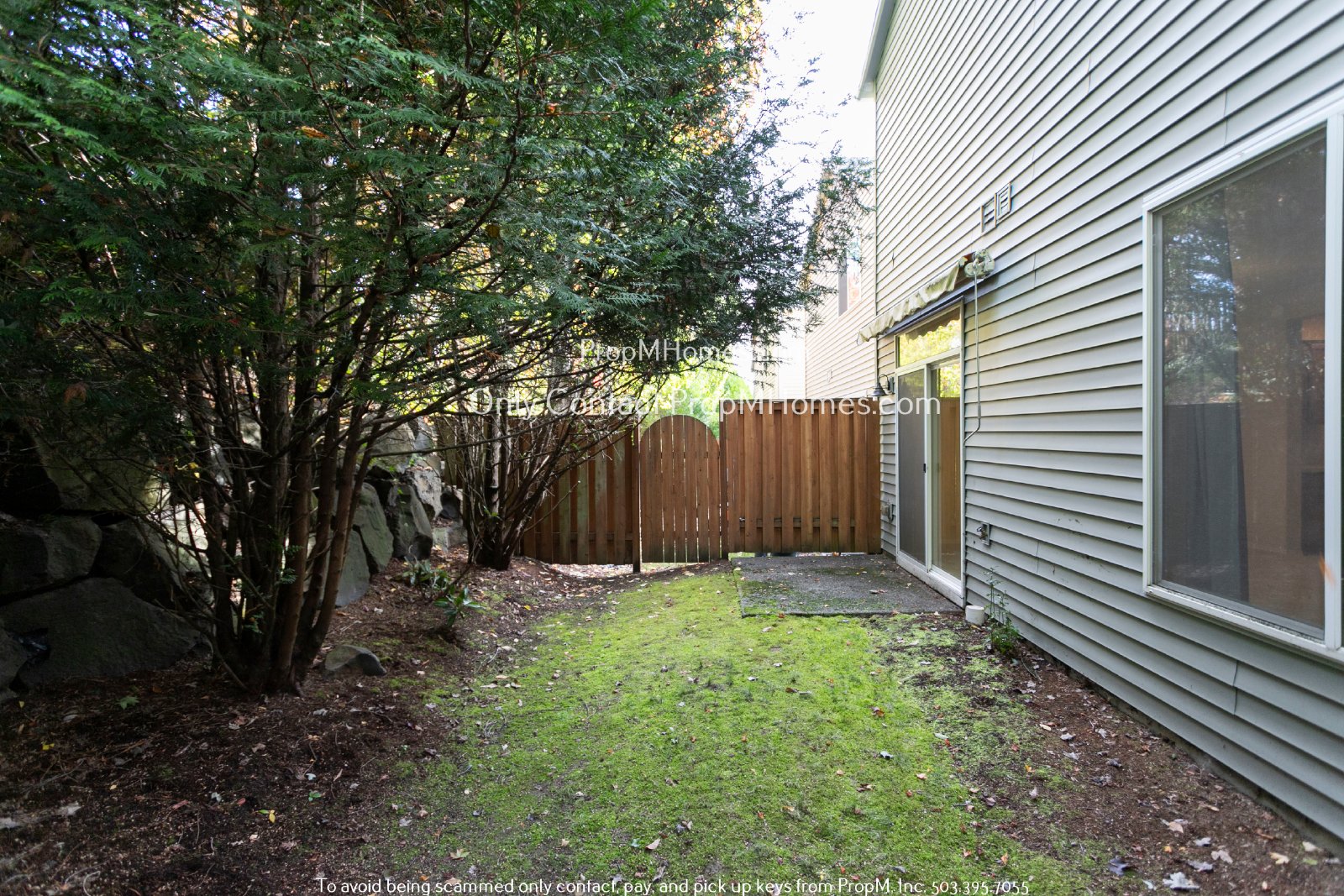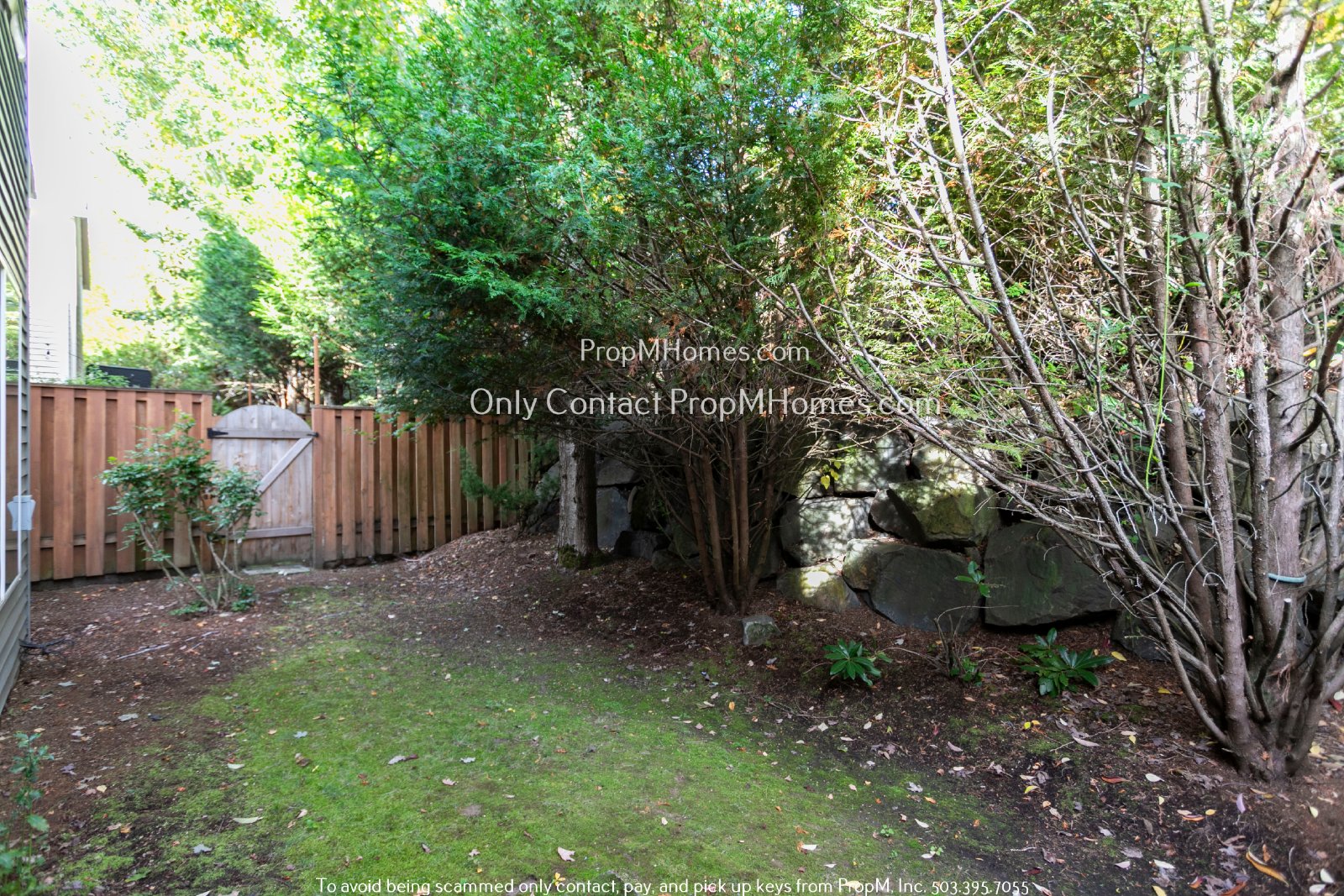 The exterior space is both functional and inviting, with a two-car garage and additional driveway parking. The partially fenced backyard is a private retreat featuring a grassy area, mature trees, and a patio—perfect for morning coffee, weekend barbecues, or simply enjoying the outdoors.