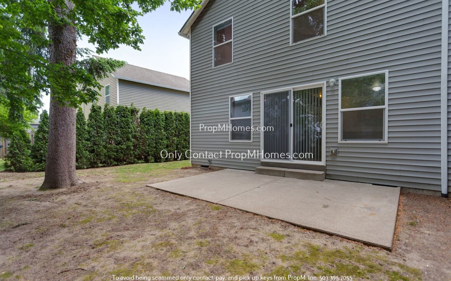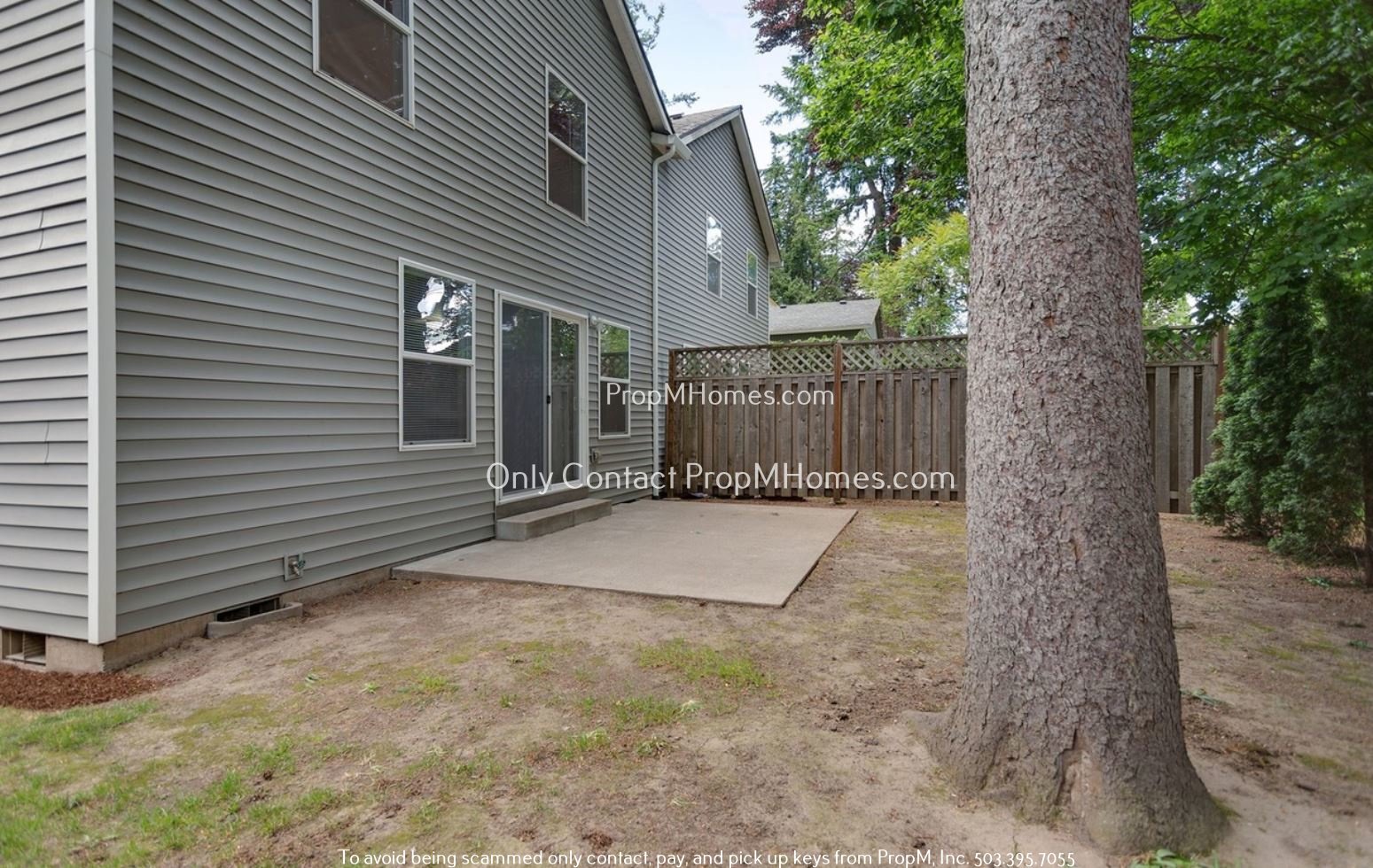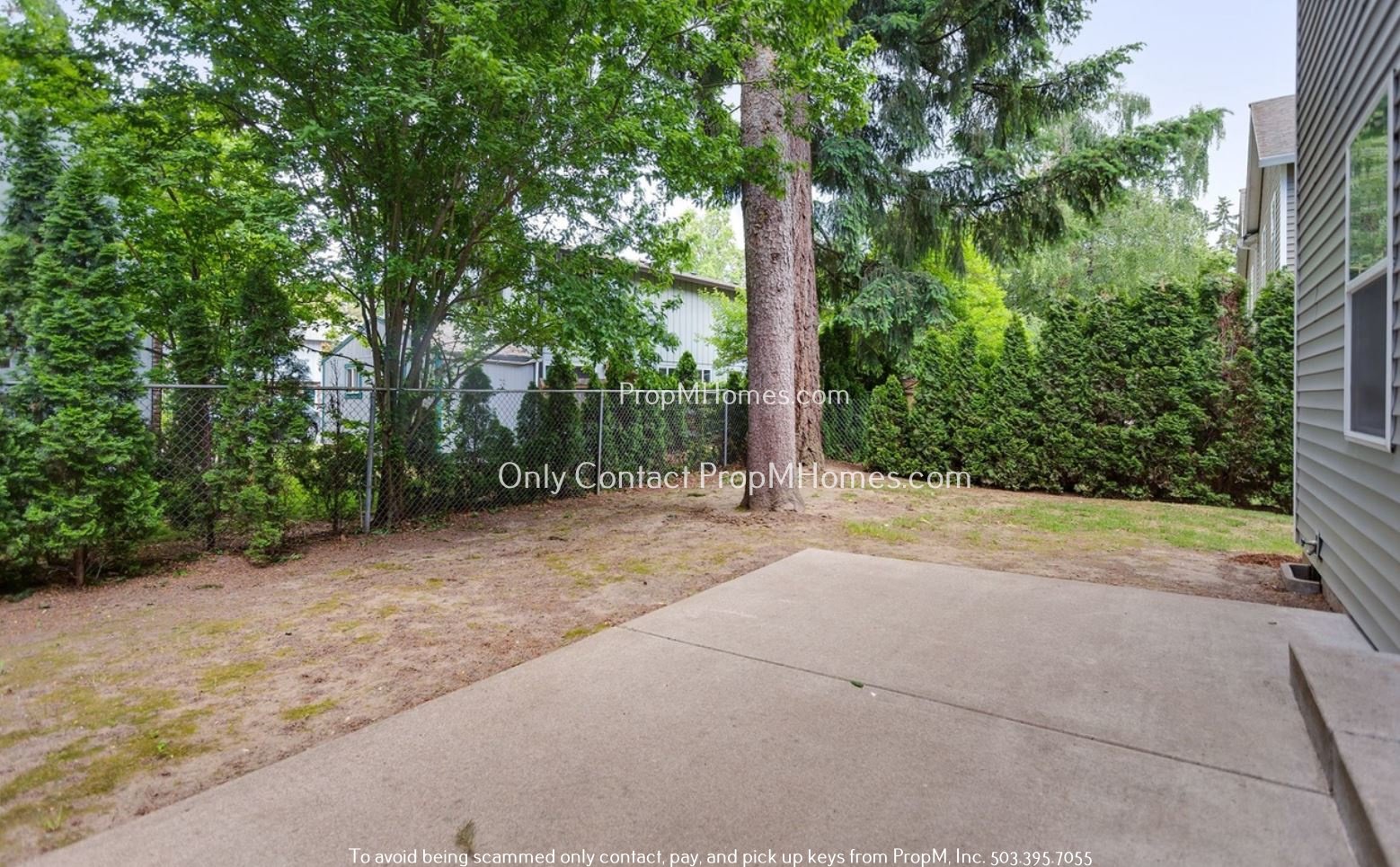 This property features an attached garage and a shared driveway, where parking must be kept to the right side. The private, fenced backyard offers a sense of tranquility and is ideal for pets. The yard includes a patio space perfect for outdoor seating or entertaining, with lush trees adding privacy and natural shade. The surrounding greenery and fenced perimeter create a secluded atmosphere, ideal for enjoying the outdoors in peace.