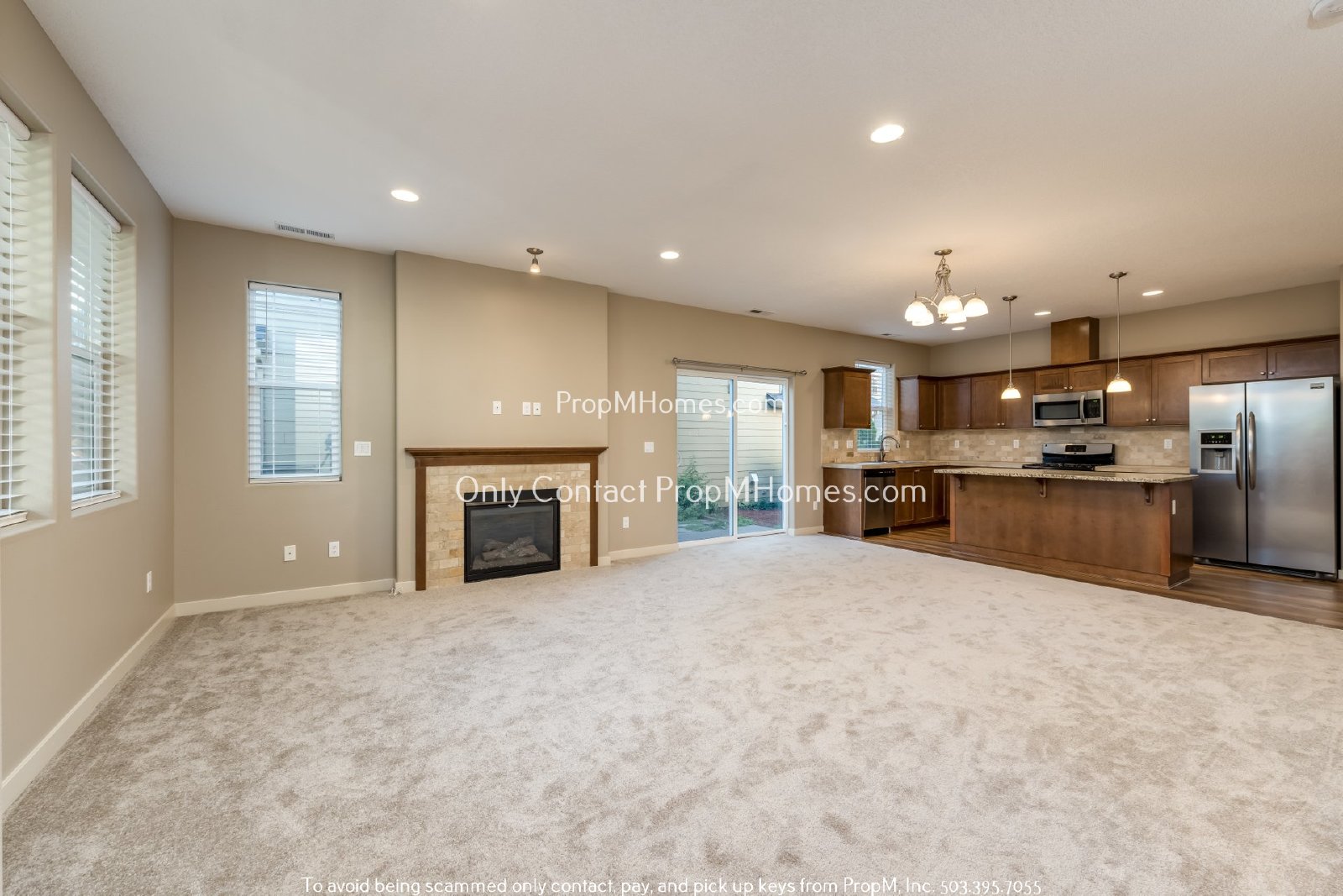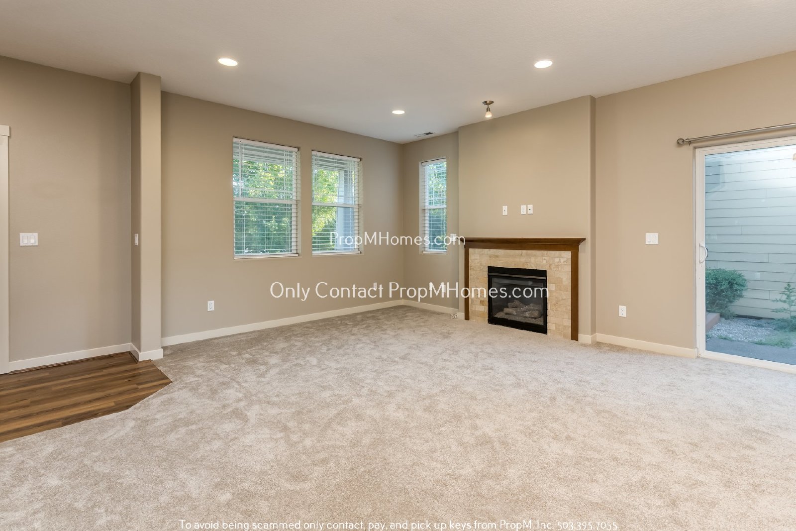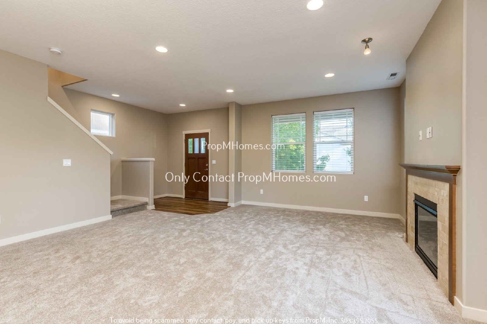 The open-concept living area offers an inviting and contemporary space, featuring plush neutral carpeting and rich hardwood flooring transitions. A stylish gas fireplace with stone surround serves as an elegant focal point, while recessed lighting and large windows fill the space with abundant natural light. The seamless flow between the living room and kitchen creates an ideal layout for both daily living and entertaining, with the staircase adding architectural interest to the modern design.