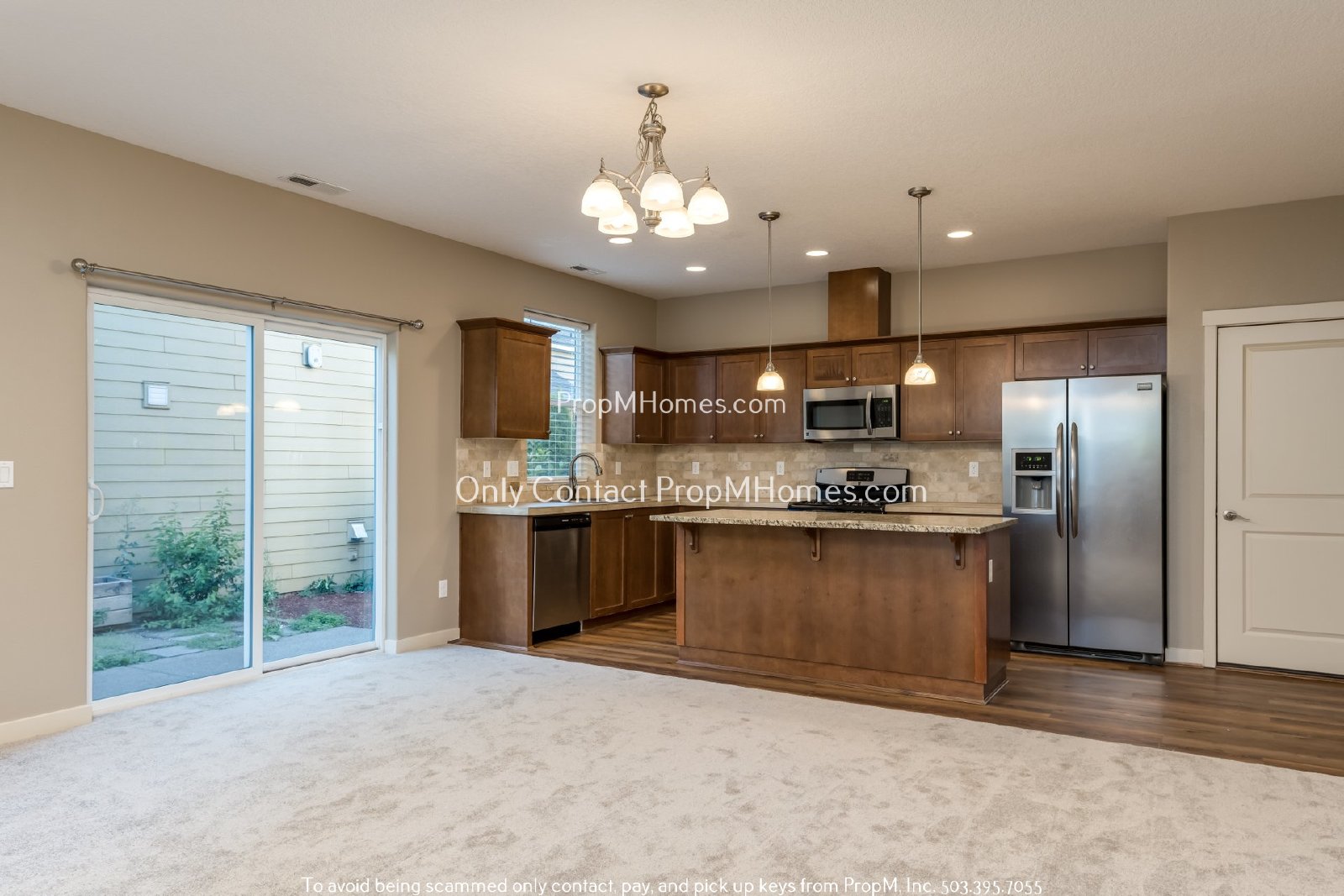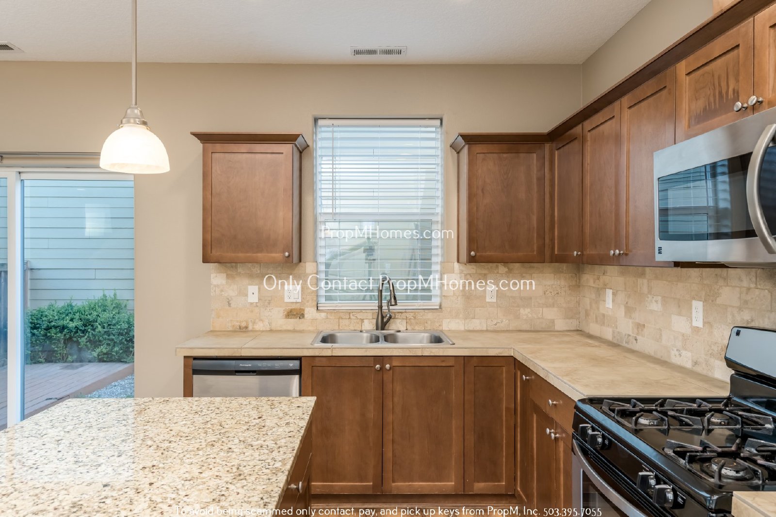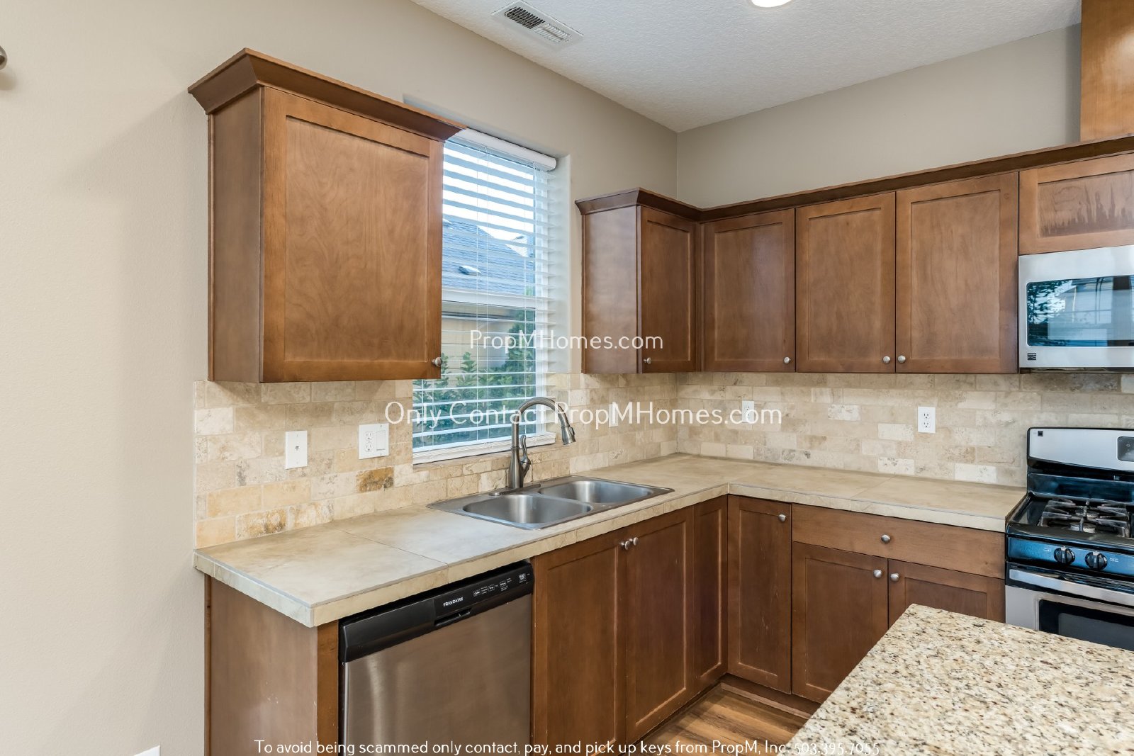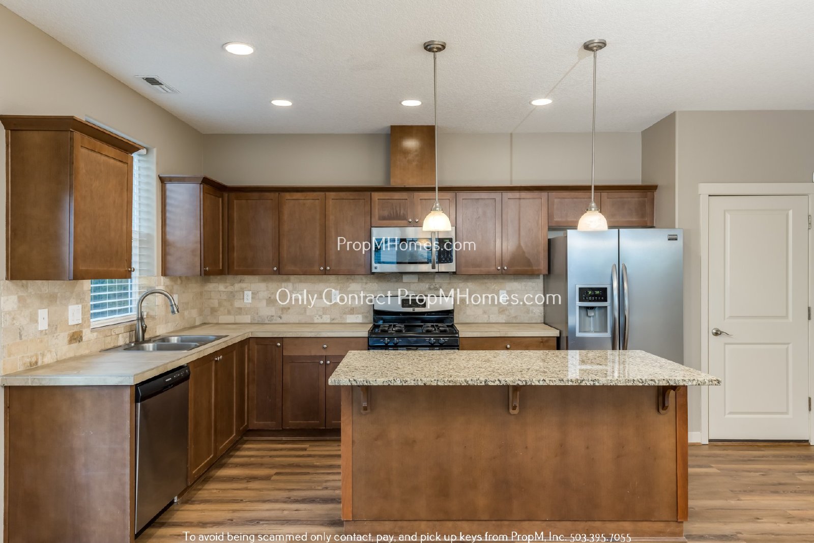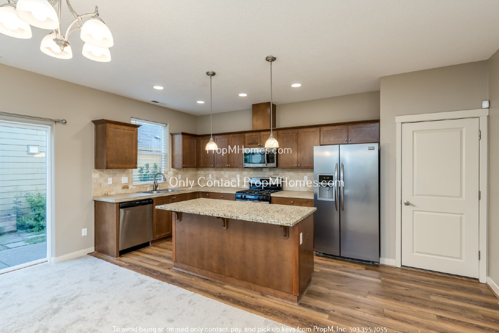 This inviting kitchen features warm maple cabinetry complemented by granite countertops and a neutral stone backsplash. The well-designed L-shaped layout includes a center island with breakfast bar seating, while modern vinyl plank flooring and pendant lighting add contemporary touches. Included stainless steel appliances feature a refrigerator with water/ice dispenser, dishwasher, built-in microwave, and gas range/oven combination. The abundance of storage and counter space makes this kitchen both functional and stylish for everyday living.