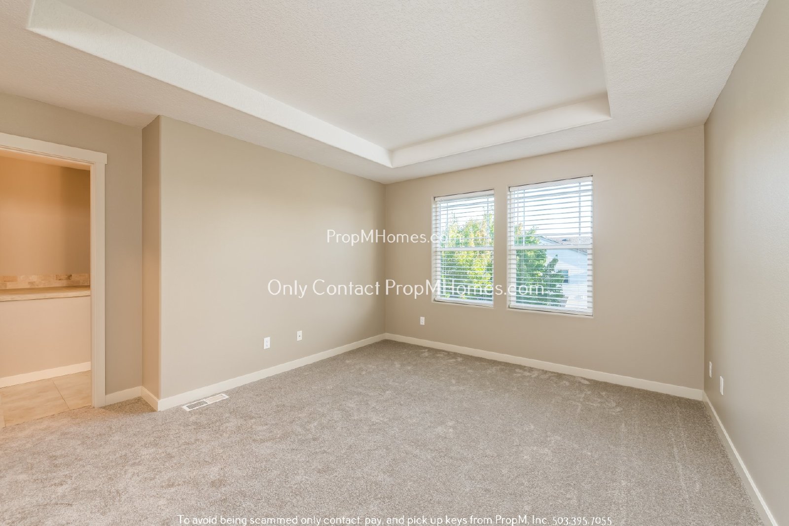 The home features three thoughtfully designed bedrooms, including a luxurious primary suite with a tray ceiling, plush carpeting, and a generous walk-in closet. The primary bathroom offers the convenience of a double vanity and a spa-like shower, while the two secondary bedrooms share a well-appointed full bathroom. A powder room on the main level provides additional convenience for guests. All bedrooms feature neutral paint colors, plenty of natural light through large windows, and ample closet space for storage.