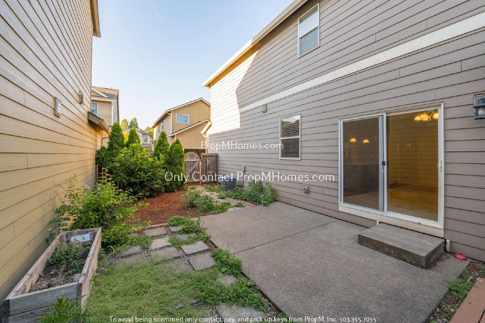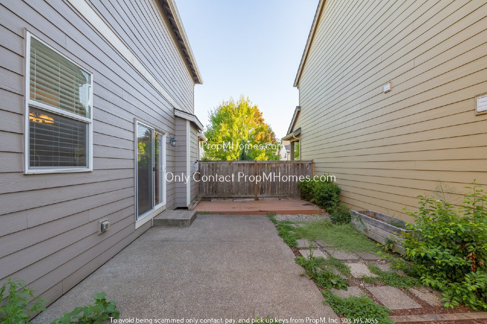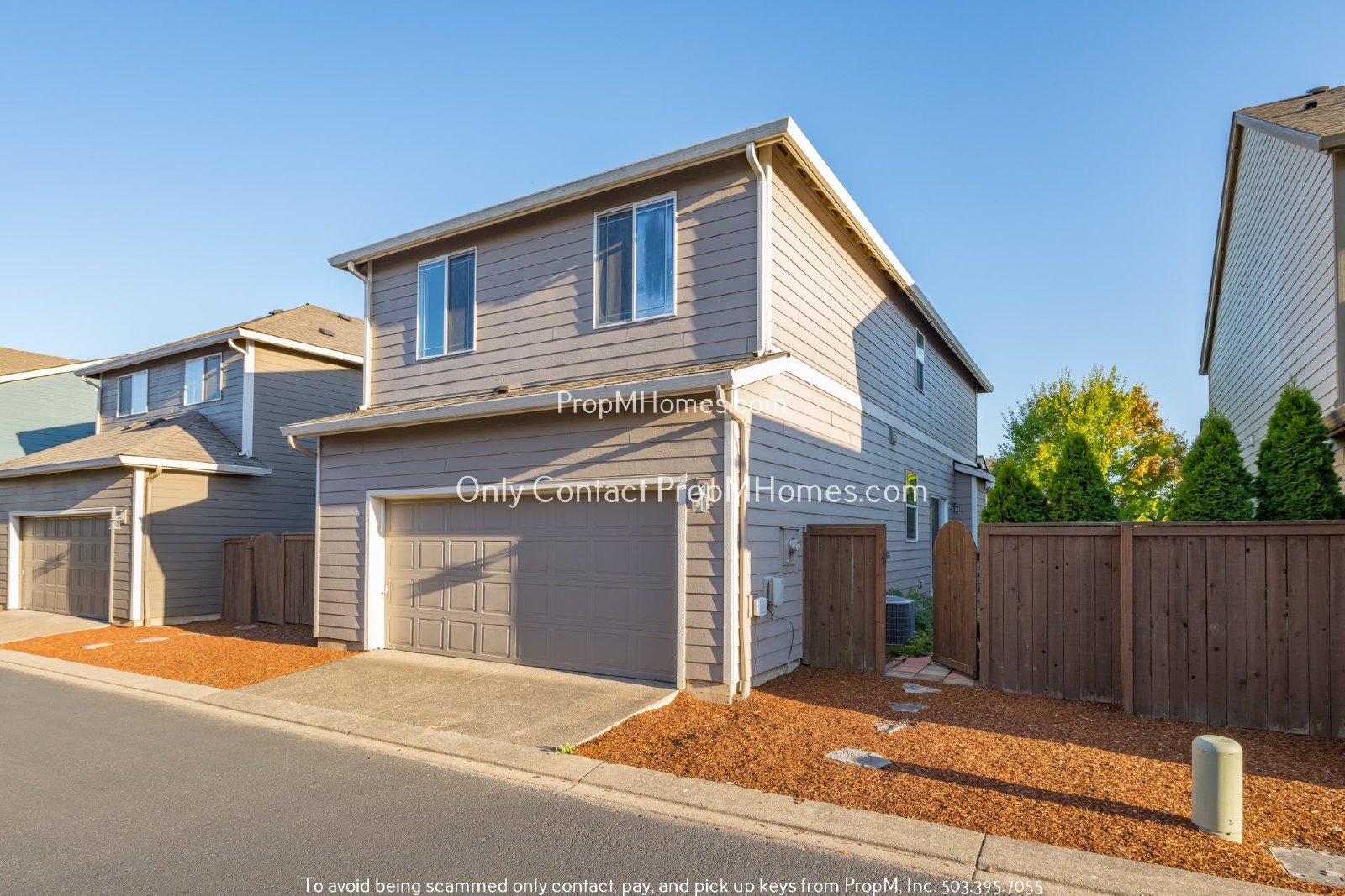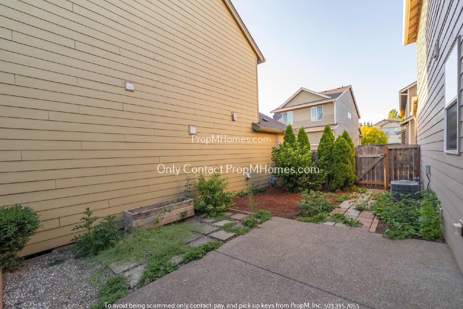 This home features a spacious attached double-car garage with a modern automatic opener for convenient access. The well-maintained exterior includes fresh bark dust landscaping along the sides of the driveway, creating an attractive approach to the home. The concrete extends to a walkway that leads to the backyard, making for easy access between parking areas and outdoor living spaces.