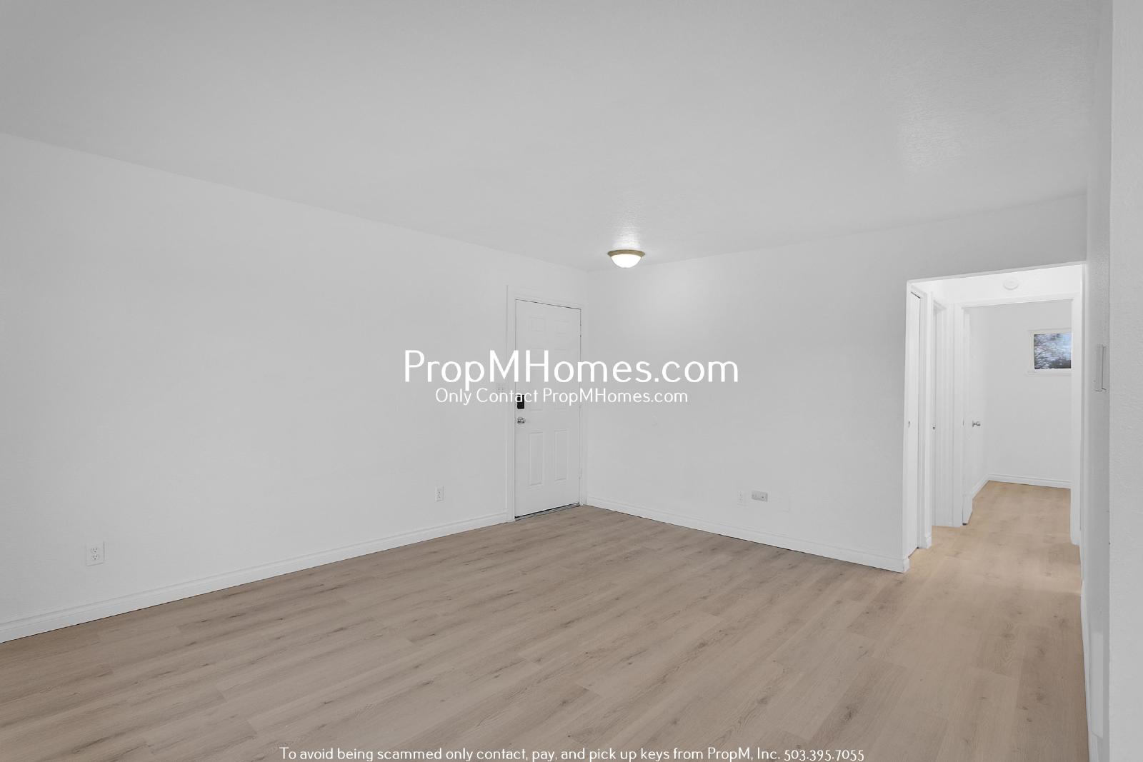 Step into a living area that blends warmth and space. This inviting space is fitted with brand new wood-like flooring, freshly painted white walls, a broad window for natural lighting, and an overhead light, creating the perfect ambiance for intimate gatherings or quiet evenings at home.