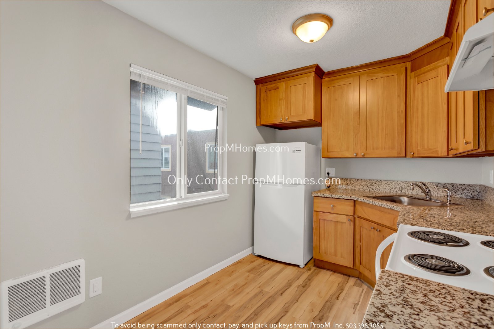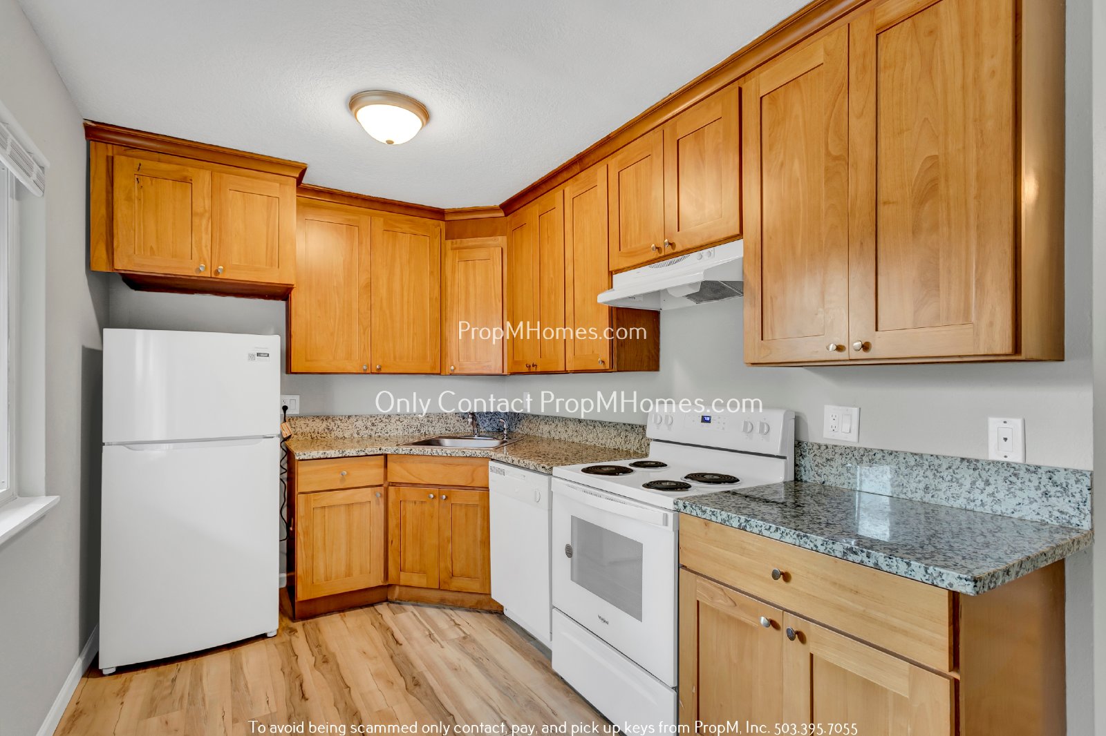 This cozy kitchen offers a clean, modern design with wood cabinetry, sleek countertops, and bright natural light. It features essential appliances, including a Whirlpool refrigerator, an electric stove with four coil burners, a range hood, and a dishwasher. The single-basin sink is complemented by ample counter space and under-cabinet storage, perfect for prepping meals. Luxury laminate flooring adds a warm touch, tying the room together with its stylish wood-like finish. The compact yet functional layout is ideal for efficient cooking and everyday convenience. *Photos are of a similar unit and cabinet color and finishes may vary.