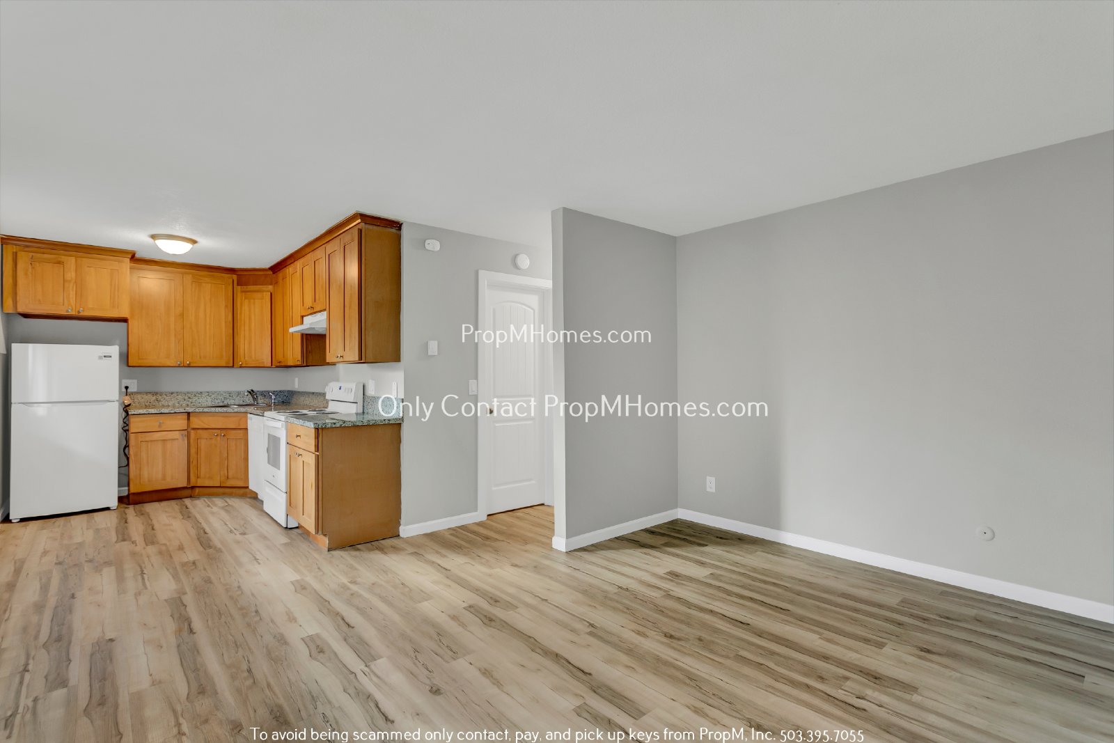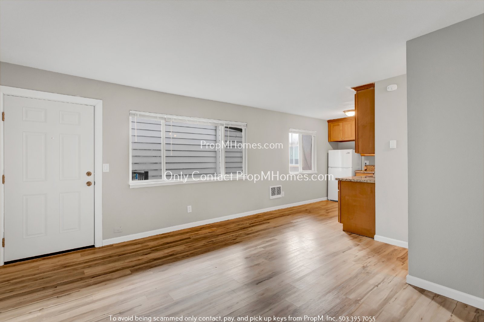 The spacious living area showcases luxury laminate flooring that seamlessly connects with the kitchen, offering a cohesive and open layout. Large windows allow natural light to fill the room, enhancing the warm tones of the flooring and soft neutral walls. The open-concept design ensures a smooth transition between the living and kitchen areas, perfect for both relaxation and entertaining. With its flexible layout, there’s plenty of space for comfortable seating and dining, providing a modern and low-maintenance living experience.