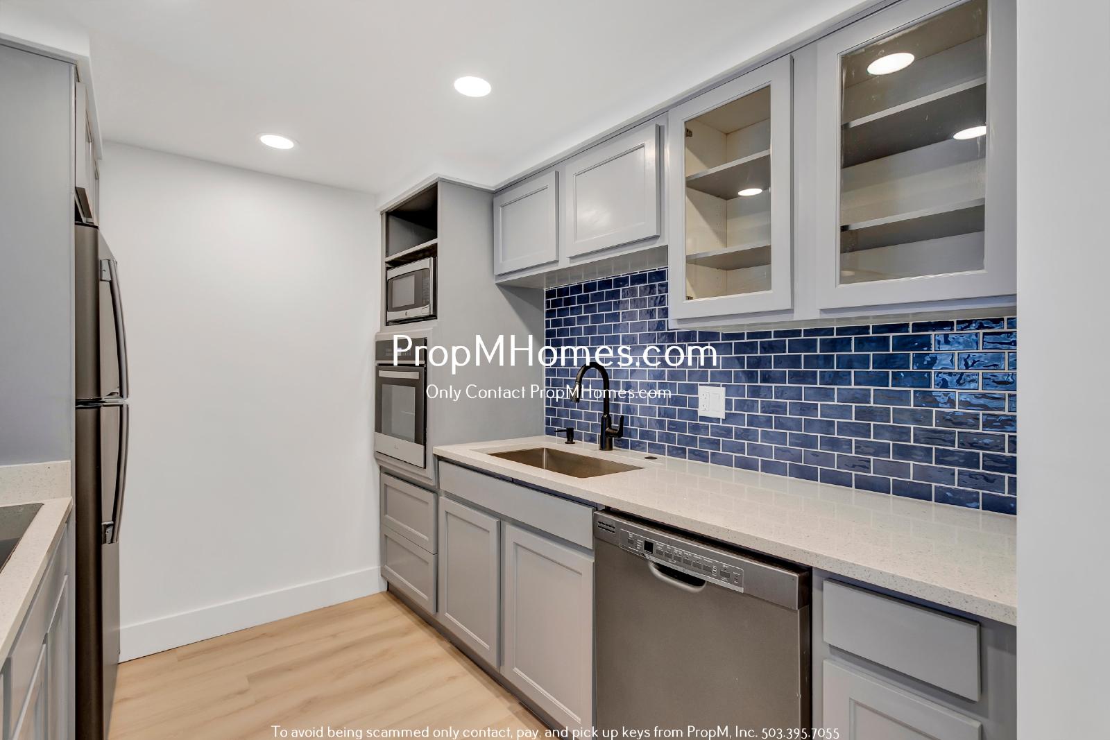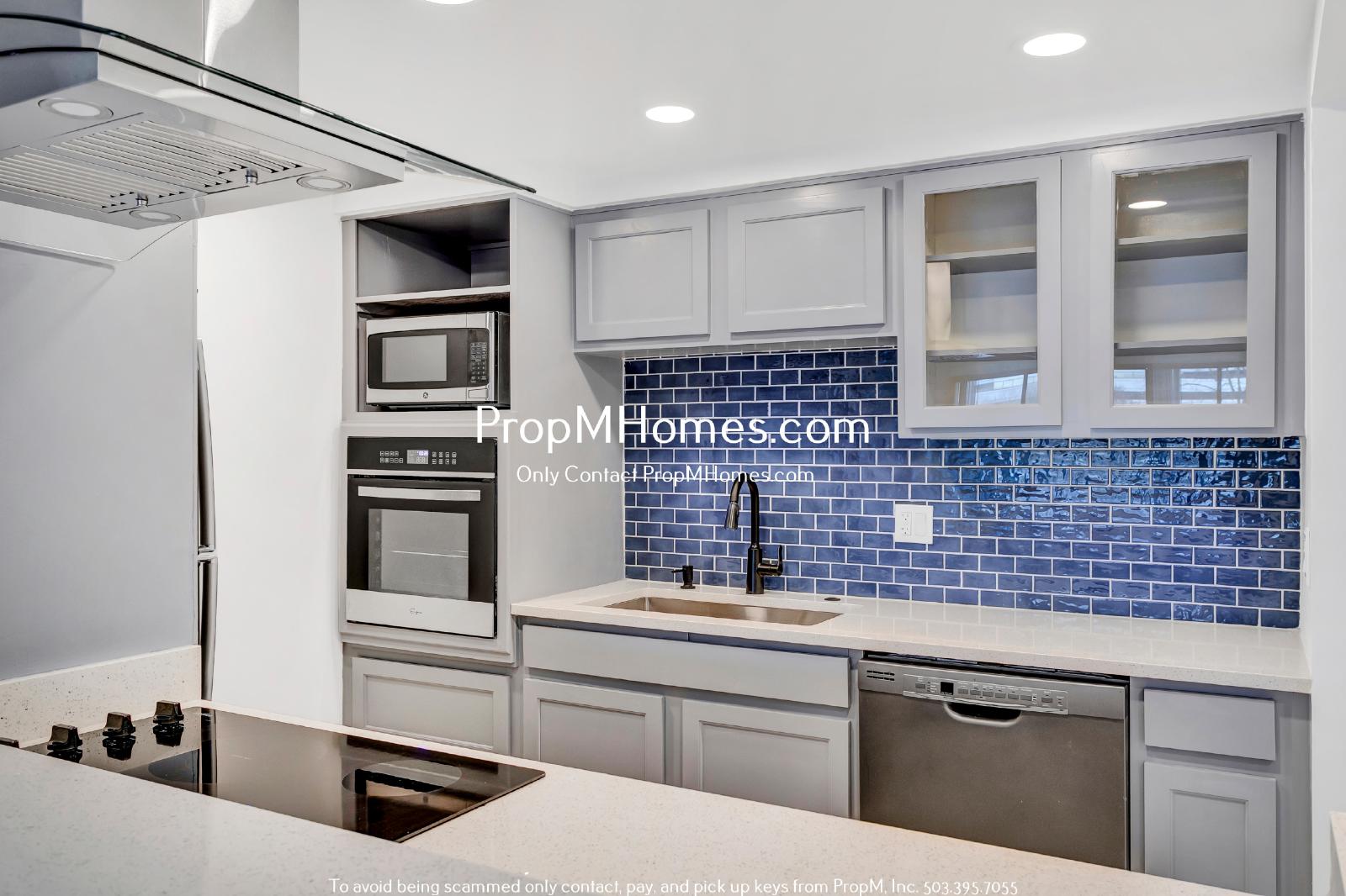 A modern and stylish kitchen featuring sleek cabinetry, gorgeous quartz countertops, and a stunning backsplash that adds a pop of color. Equipped with stainless steel appliances and ample storage, this space is perfect for culinary enthusiasts. Whether you're preparing a gourmet meal or a quick snack, you'll appreciate the thoughtful design and high-end finishes. Your appliances include a refrigerator/freezer, dishwasher, microwave, electric stovetop, and an oven.