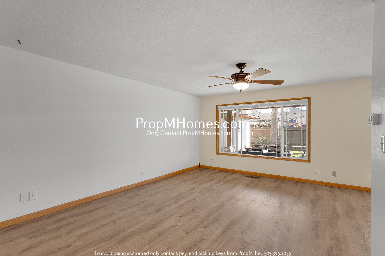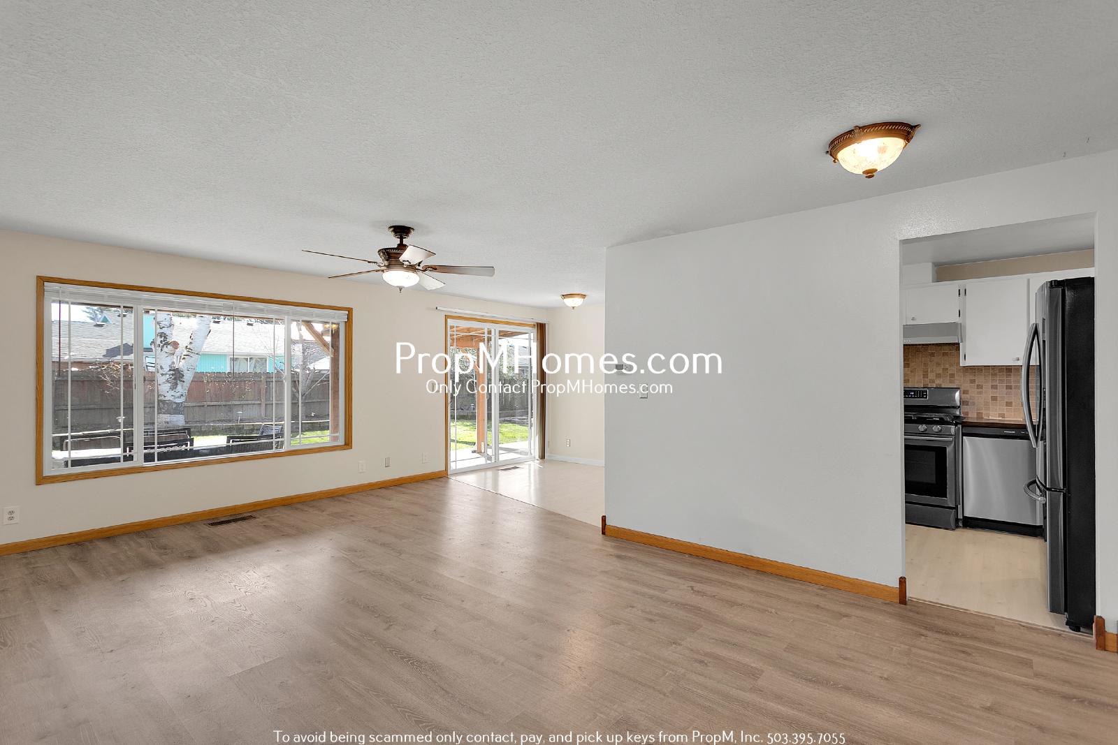 Step inside to a bright and airy open-concept living space. Large windows let in plenty of natural light, highlighting the stylish wood-style flooring and neutral tones throughout. A ceiling fan adds both comfort and charm to this spacious area, making it the perfect place to relax or entertain. Sliding doors lead to the backyard, extending your living space outdoors.
